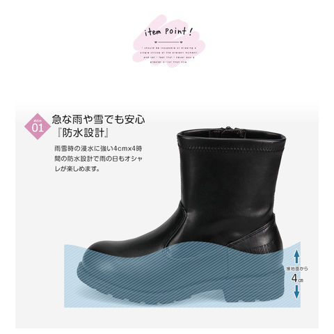 雨雪時の浸水に強い4cmx4時間の防水設計で雨の日もオシャレが楽しめます。