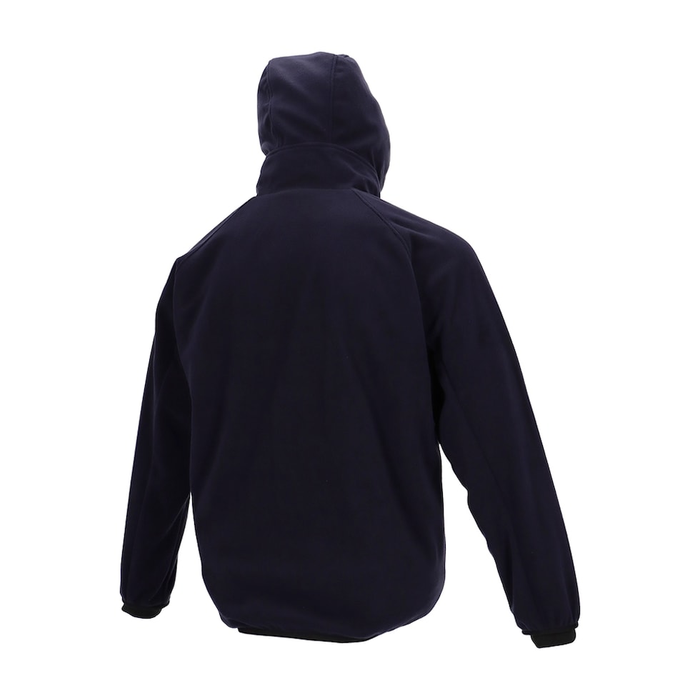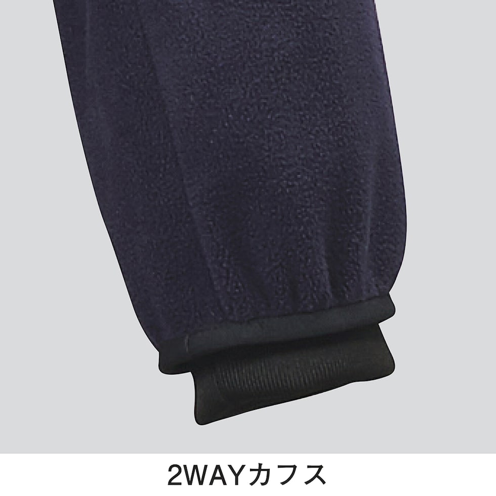 やわらかく防風性に優れたフリースジャケット長袖パーカ。衿高で首元まで暖かく袖口部分のカフスを折り込んだり、引き出すことで外気の侵入を軽減し保温性を保ちます。