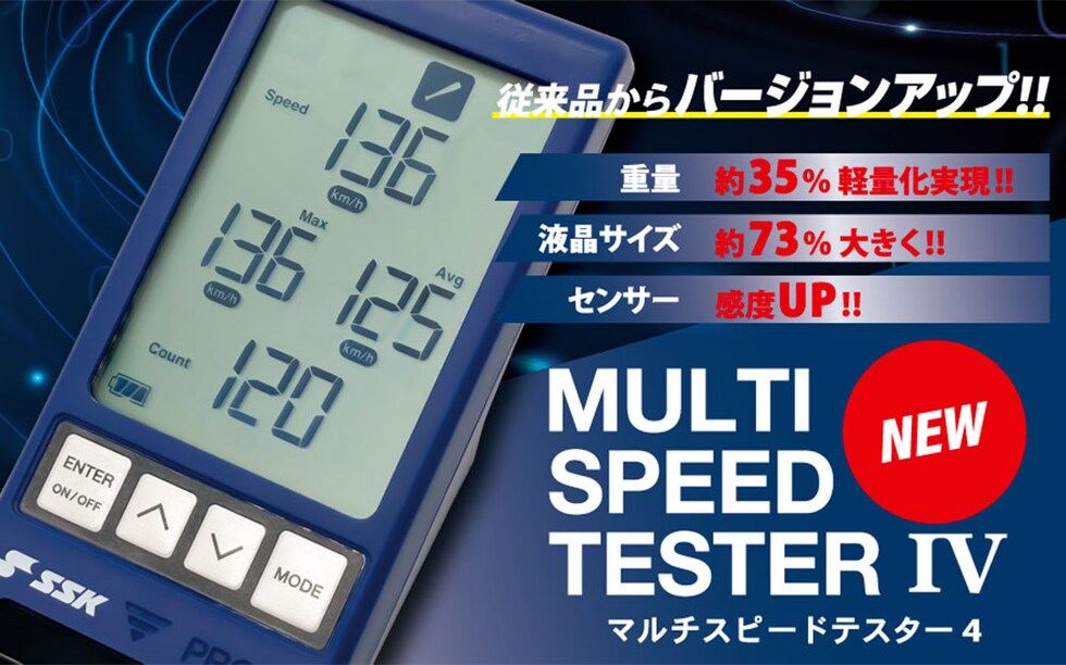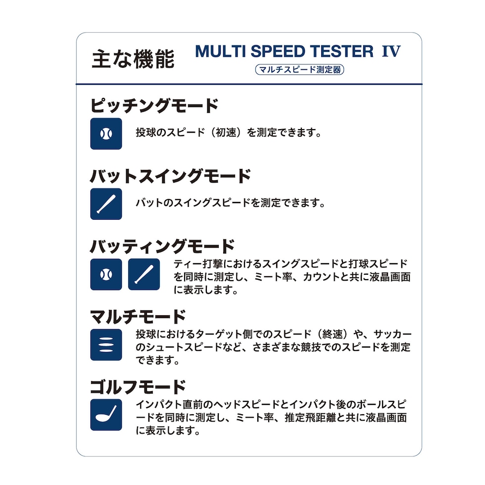 IoTで野球が変わる!マルチスピードテスターⅣ。従来品から35%軽量化、液晶画面は73%大きくなり、センサーの感度もアップしたモデルが登場しました。ピッチングモード・バットスイングモード・バッティングモード・マルチモード・ゴルフモードの5つのモードを搭載。プレーを「数値化」することでトレーニングを向上させます。野球はもちろん、サッカーやゴルフにも活用できるアイテムです。●マイクロ波センサー 発振周波数:24GHz(Kバンド) 送信出力/10mW以下●測定可能範囲 ・ピッチングモード、バットスイングモード、バッティングモード スイングスピード/ボールスピード:30km/h~180km/h・マルチモード スピード:30km/h~300km/h・ゴルフモード ヘッドスピード/ボールスピード;10m/s~90m/s