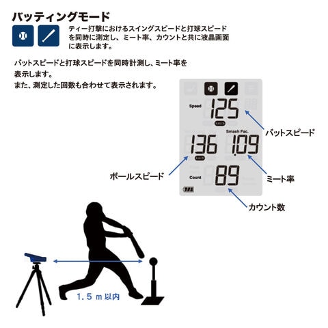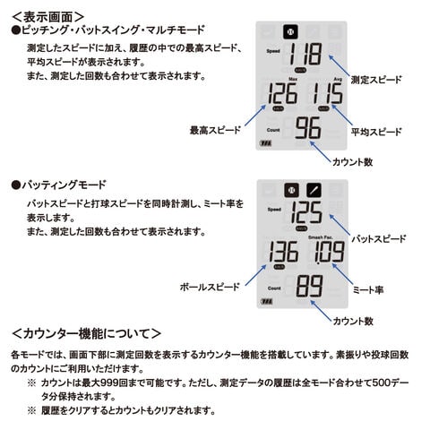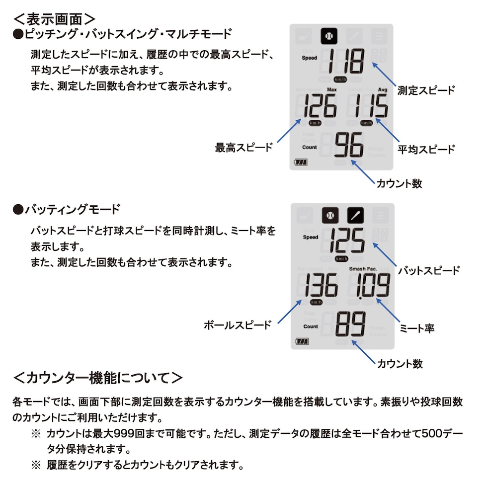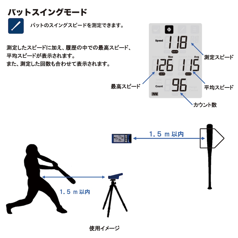 ●測定可能範囲 ・ピッチングモード、バットスイングモード、バッティングモード スイングスピード/ボールスピード:30km/h~180km/h ・マルチモード スピード:30km/h~300km/h ・ゴルフモード ヘッドスピード/ボールスピード 10m/s~90m/s
