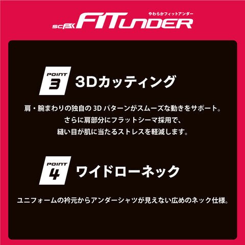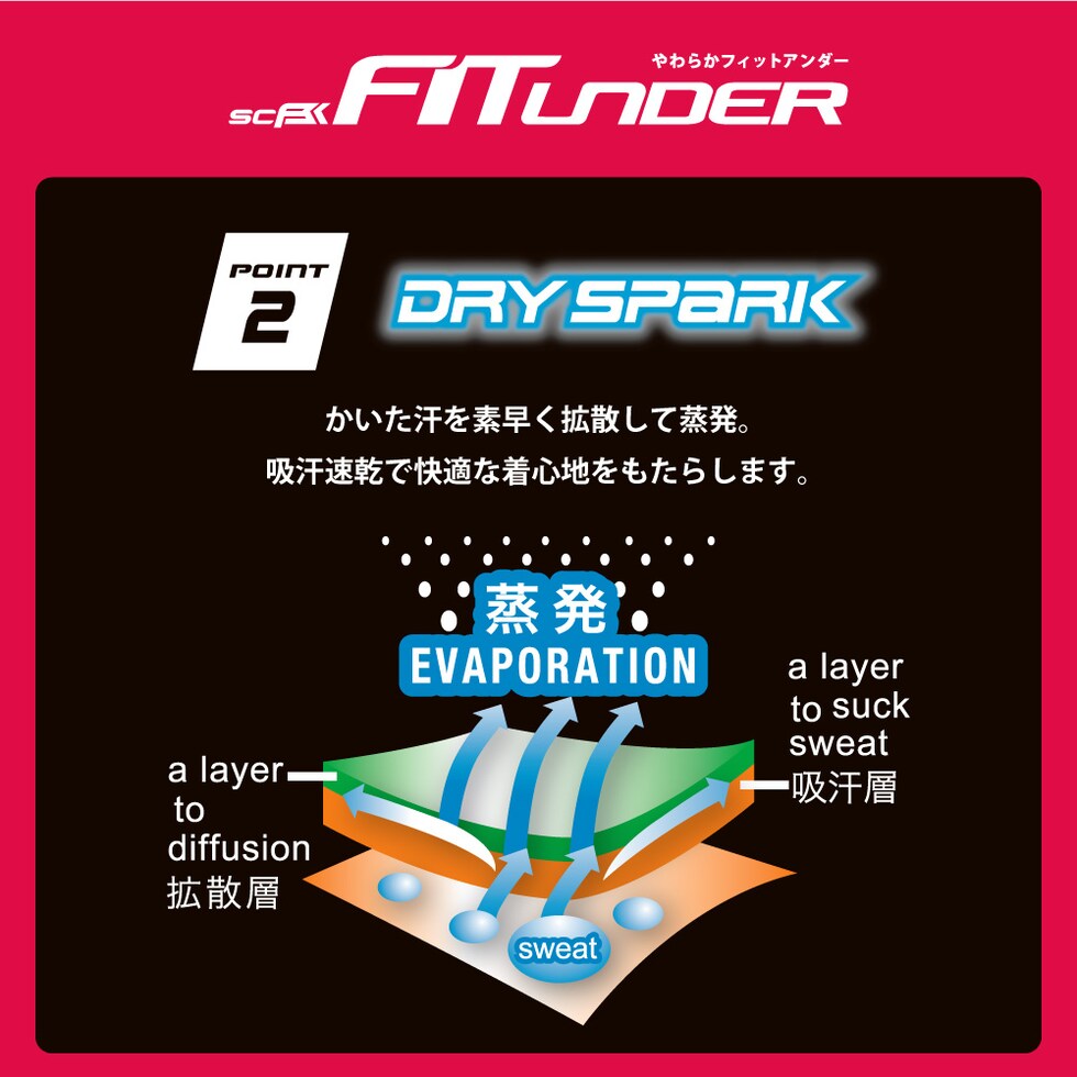 吸汗速乾「DRY SPARK」機能と伸縮性の高い2WAY素材でフィット感と柔らかな着心地を実現。脇切替部にメッシュ素材を採用し、軽量感と速乾性を向上させました。