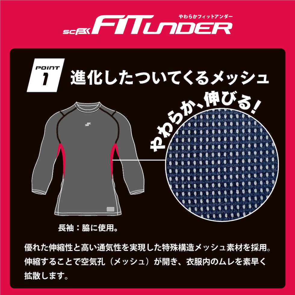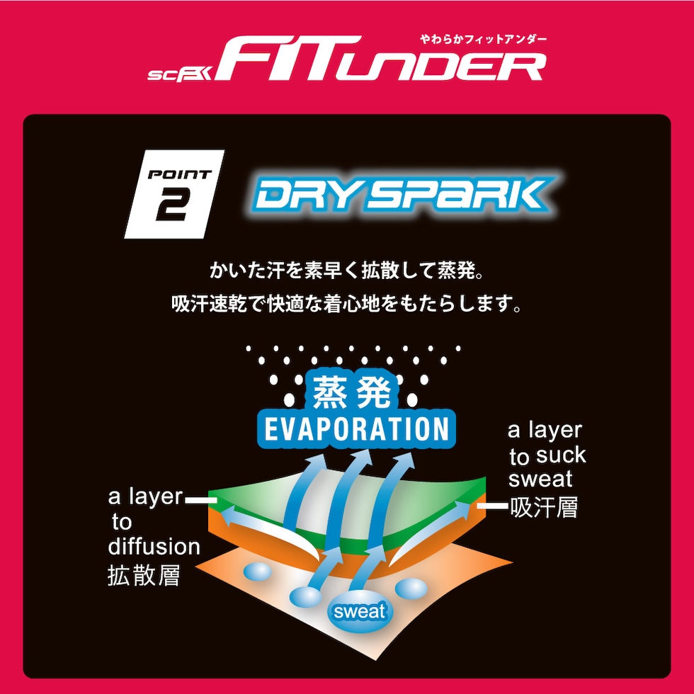 吸汗速乾「DRY SPARK」機能と伸縮性の高い2WAY素材でフィット感と柔らかな着心地を実現。脇切替部にメッシュ素材を採用し、軽量感と速乾性を向上させました。