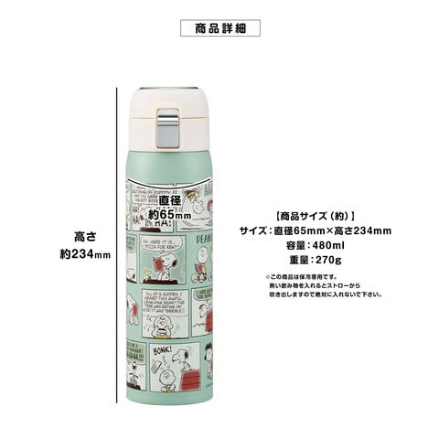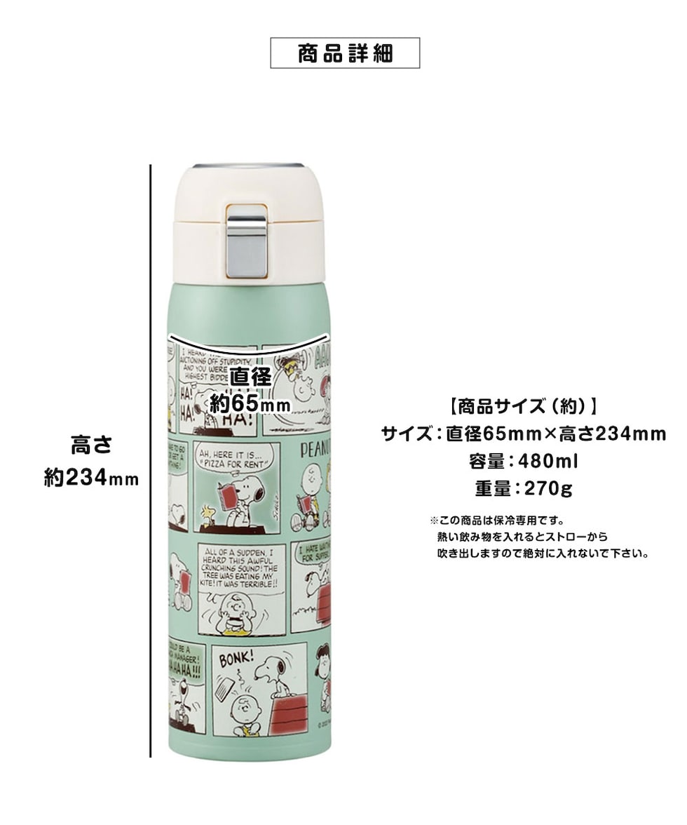 水筒 480ml 保冷 ワンタッチ ストロー 軽量 小さめ 女性 子供 キッズ ウォーキング キャラクター かわいい スヌーピー STOT5ST