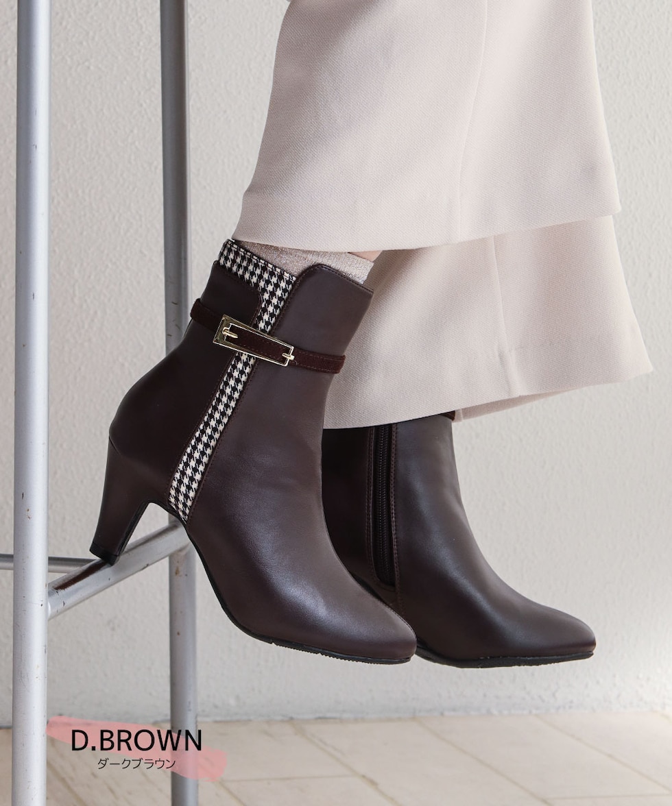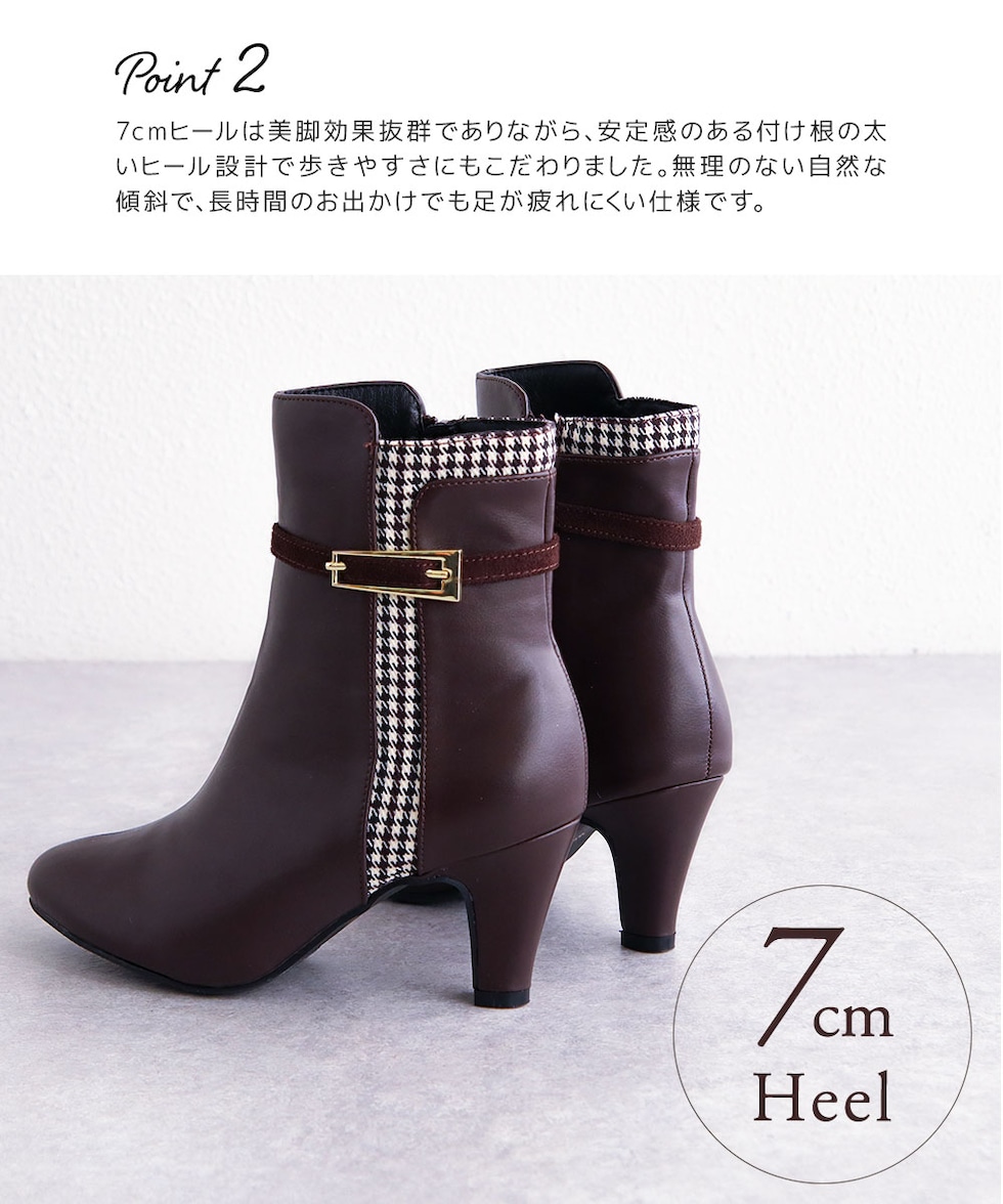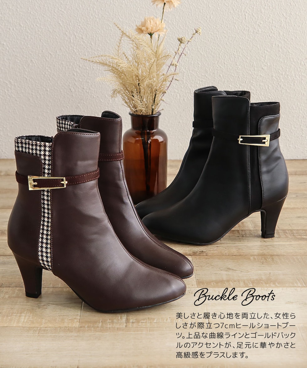 ショートブーツ レディース 7cm ヒール 美脚 千鳥格子 ゴールドバックル 大人 上品 歩きやすい 細見え 脚長効果 きれいめ 秋冬 6112