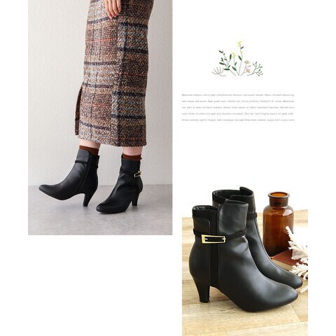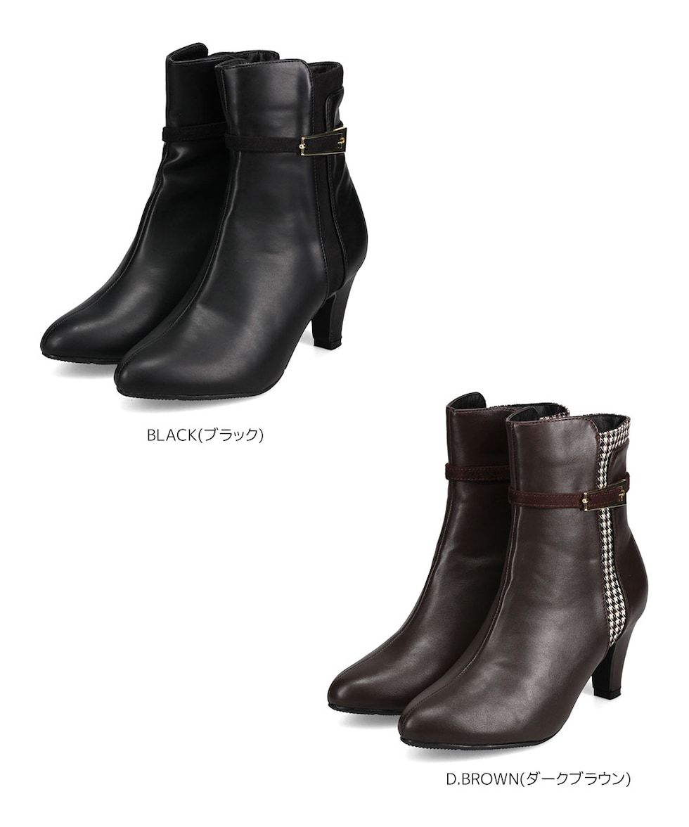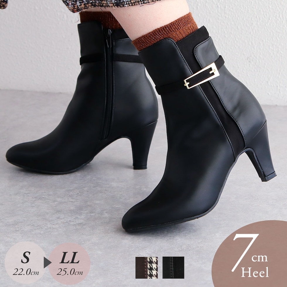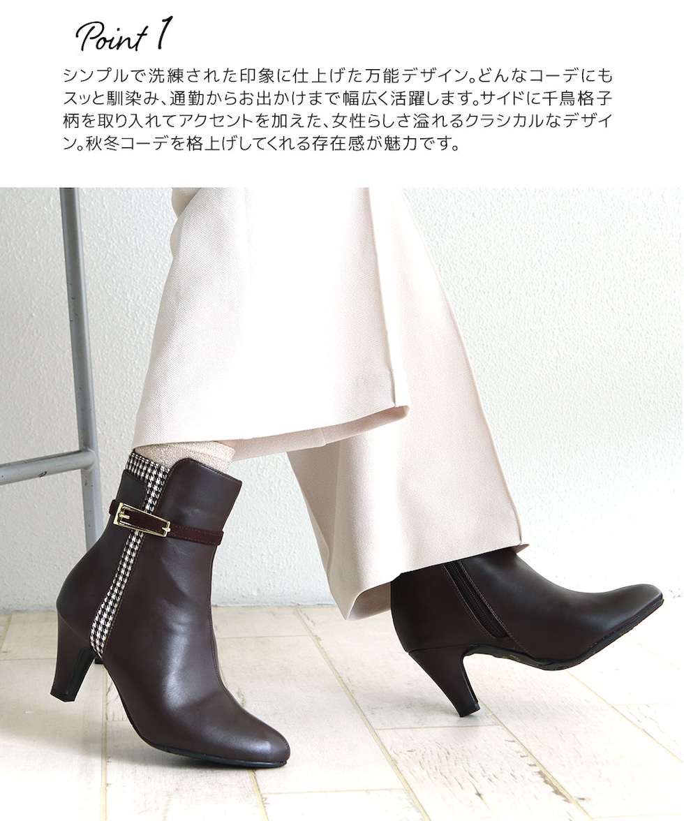 ショートブーツ レディース 7cm ヒール 美脚 千鳥格子 ゴールドバックル 大人 上品 歩きやすい 細見え 脚長効果 きれいめ 秋冬 6112