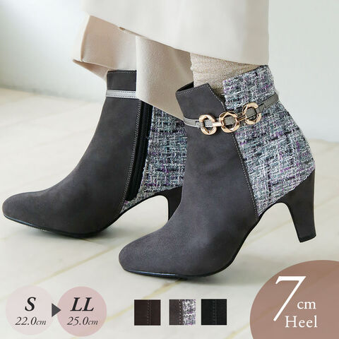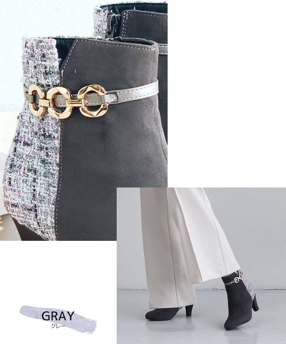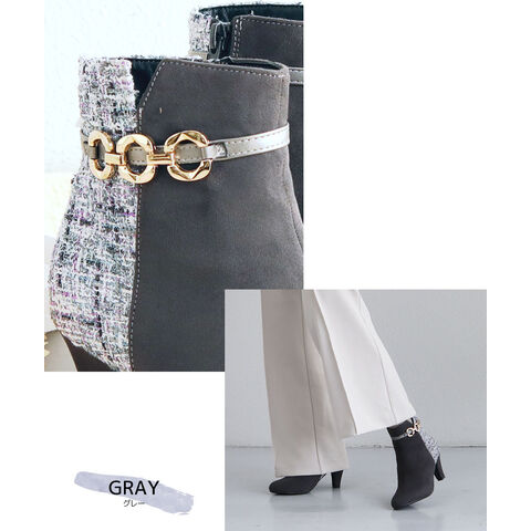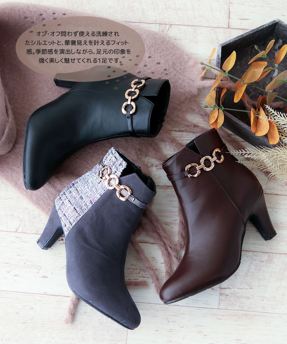 ショートブーツ レディース 7cm ヒール アーモンドトゥ 美脚 ゴールドチェーン 上品 歩きやすい 痛くない ツイード 細見え きれいめ 秋冬 6115