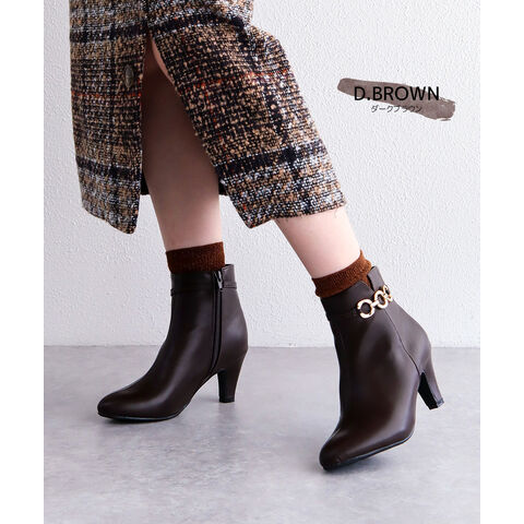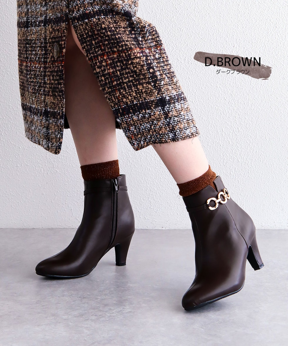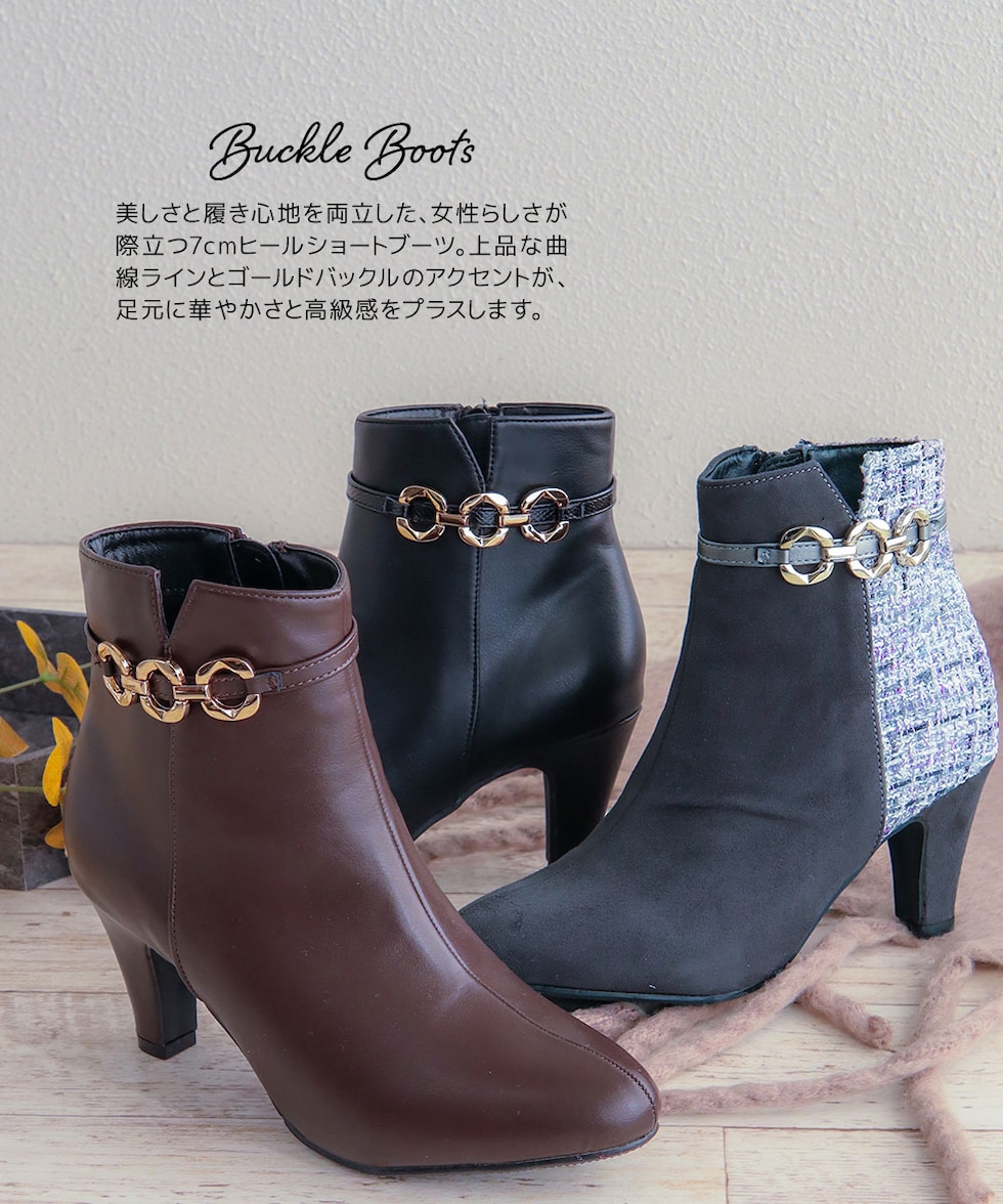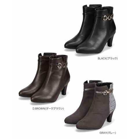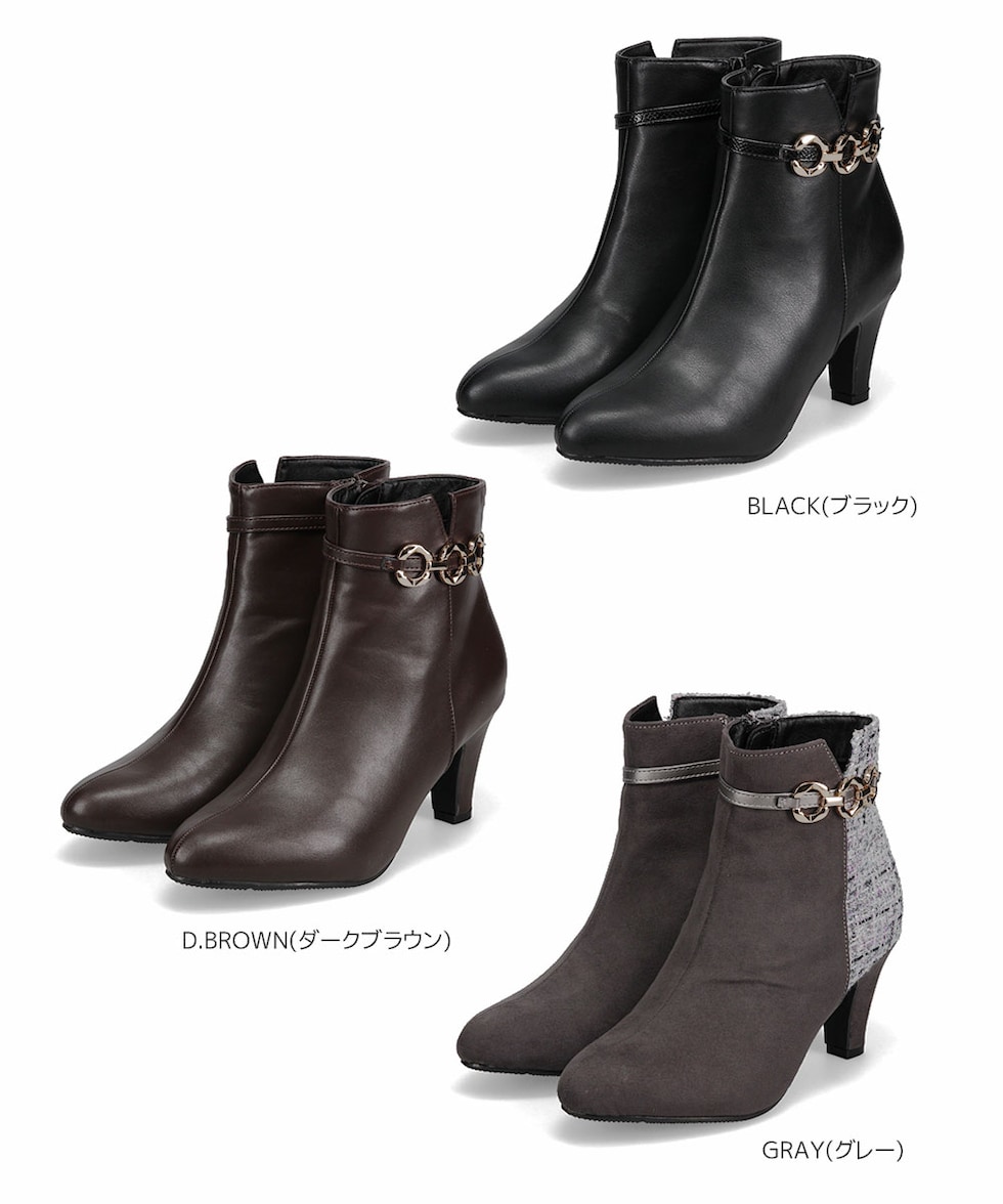 ショートブーツ レディース 7cm ヒール アーモンドトゥ 美脚 ゴールドチェーン 上品 歩きやすい 痛くない ツイード 細見え きれいめ 秋冬 6115