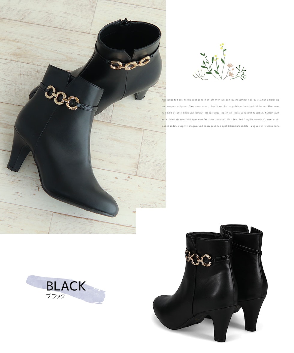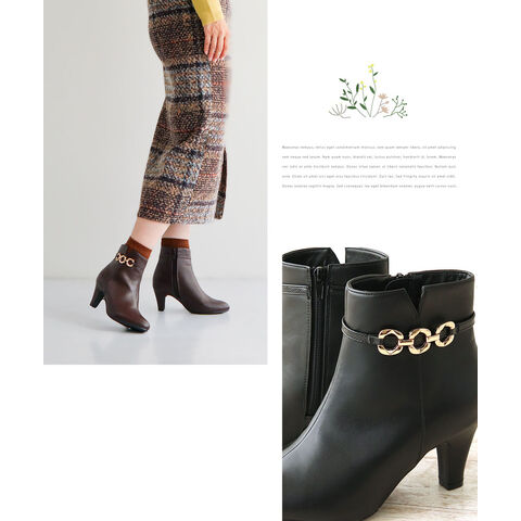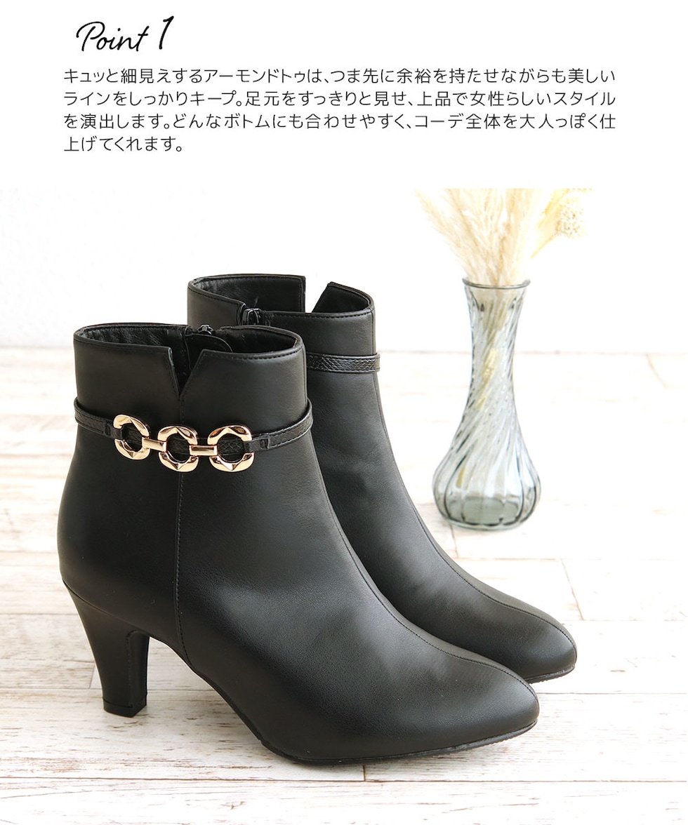 アーモンドトゥの美しいシルエットとゴールドチェーンのアクセントが大人の女性らしさを引き立て、秋冬コーデを一気に格上げします。