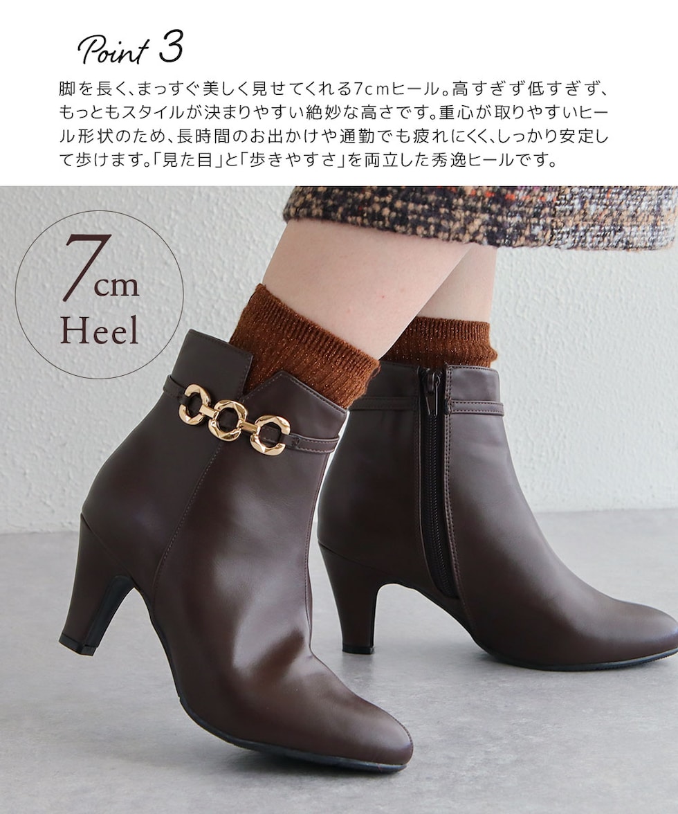 上品なデザインと歩きやすさを兼ね備えた、7cmヒールショートブーツ。