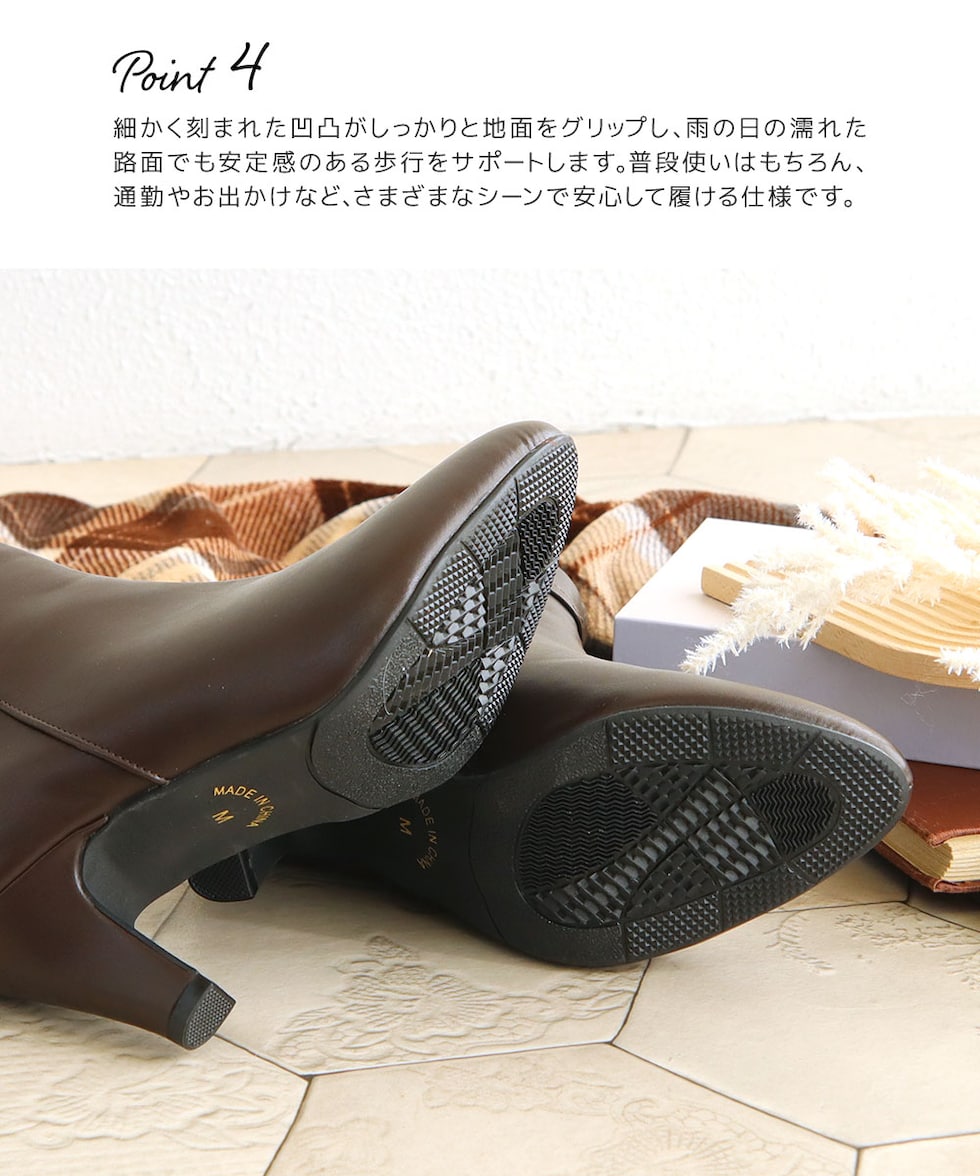 アウトソールはグリップ力のある素材を採用し、秋冬の路面でも安心感のある歩きやすさを実現。雨の日やツルっとしやすい床でも滑りにくく、日常使いに適した実用性の高い仕様です。転倒を防ぎたい方にもおすすめできる安定設計です。
