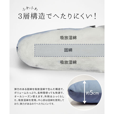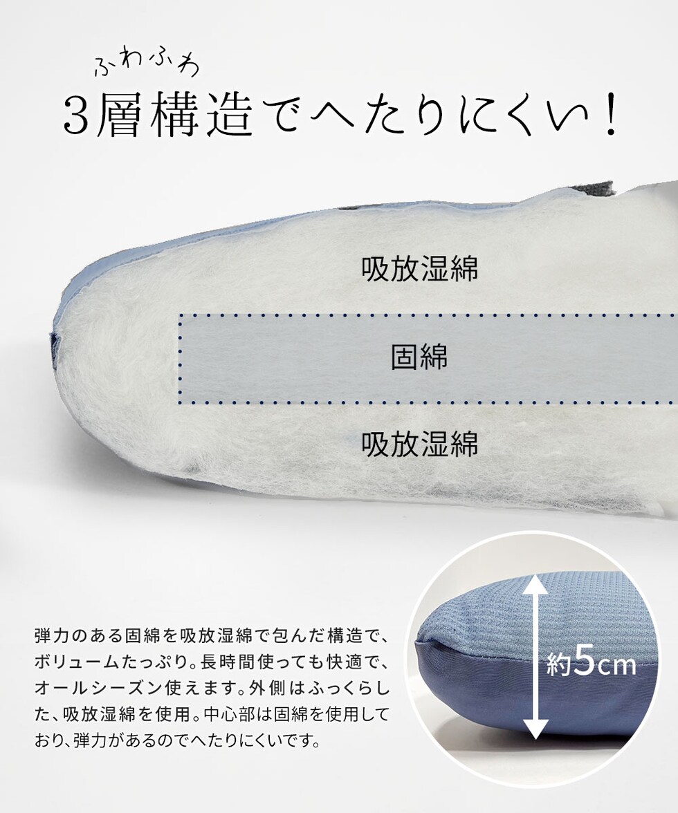 弾力のある固綿を吸放湿綿で包んだ構造で、ボリュームたっぷり。