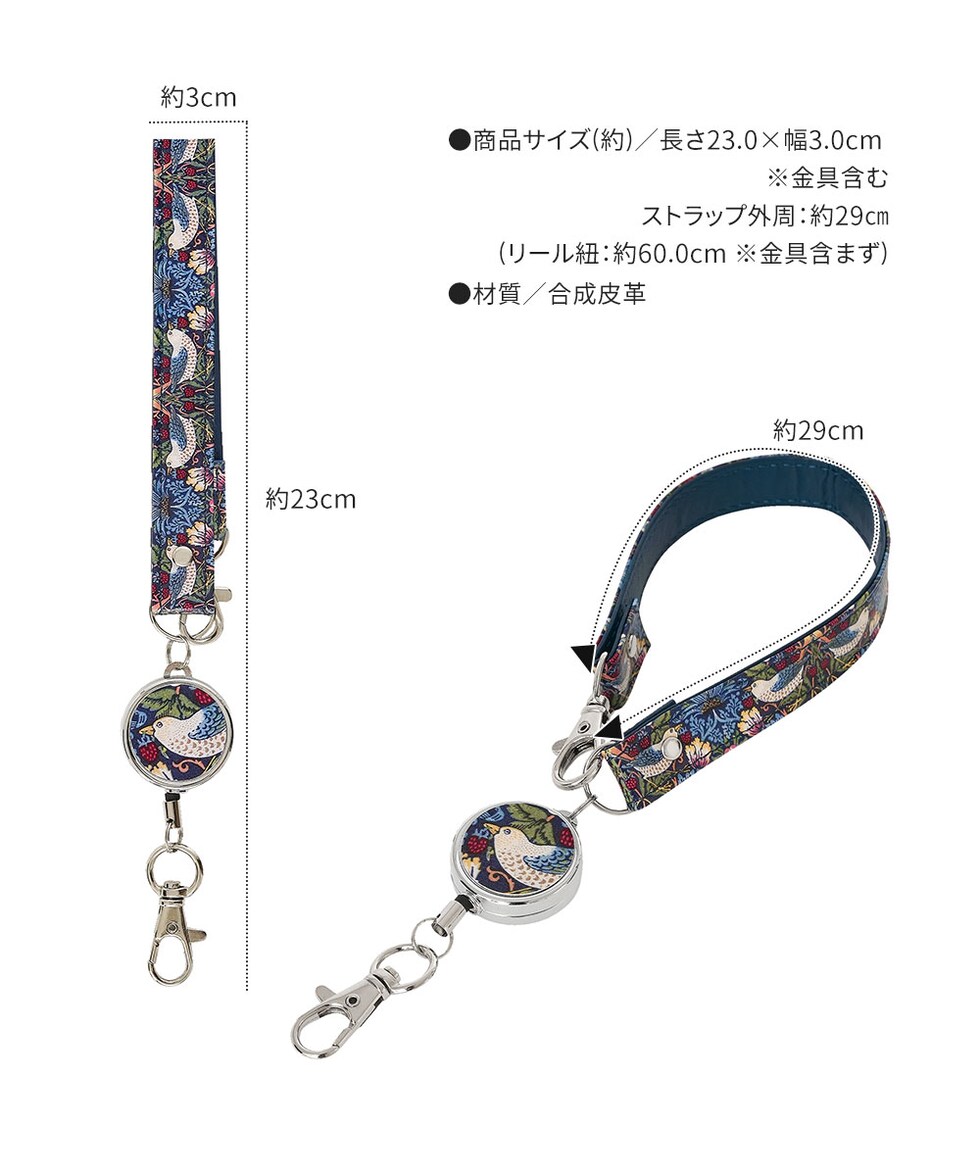●商品サイズ(約)/長さ23.0×幅3.0cm ※金具含む|ストラップ外周:約29㎝|リール紐:約60.0cm ※金具含まず