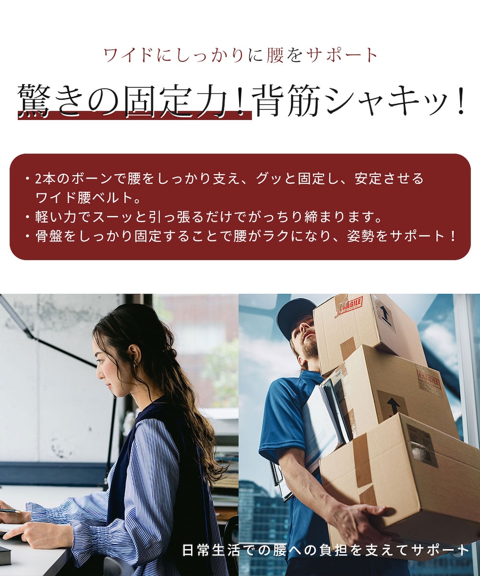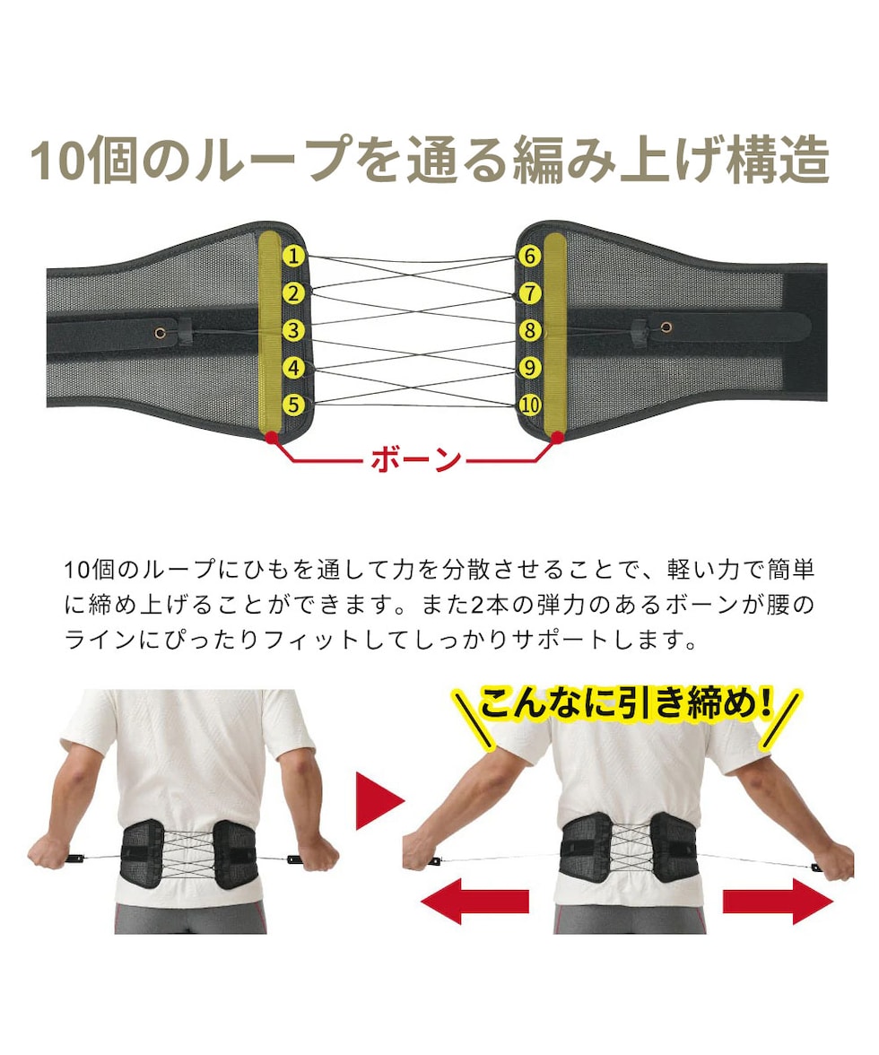 2本のボーンで腰をしっかり支え、グッと固定し、安定させるワイド腰ベルト。10個のループと2本のボーンで軽い力でしっかり固定し、腰を支える10個のループにひもを通して力を分散させて、軽い力でスーッと引っ張るだけでがっちり締まります。弾力のある2本のボーンが腰のラインにぴったりフィットし、支えてくれます。骨盤をしっかり固定することで腰がラクになり、姿勢をサポート!
