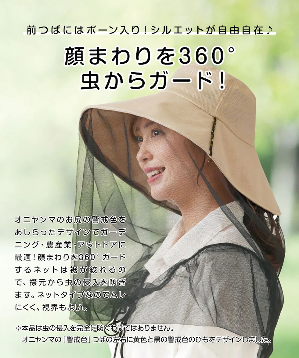 オニヤンマのお尻の警戒色をあしらったデザインでガーデニング・農産業・アウトドアに最適!顔まわりを360°ガードするネットは裾が絞れるので、襟元から虫の侵入を防ぎます。ネットタイプなのでムレにくく、視界もよい。※本品は虫の侵入を完全に防ぐわけではありません。オニヤンマの『警戒色』つばの左右に黄色と黒の警戒色のひもをデザインしました。