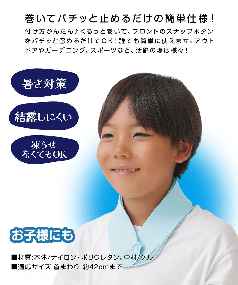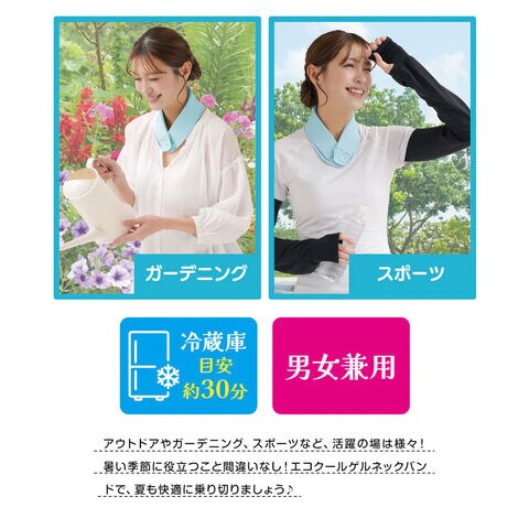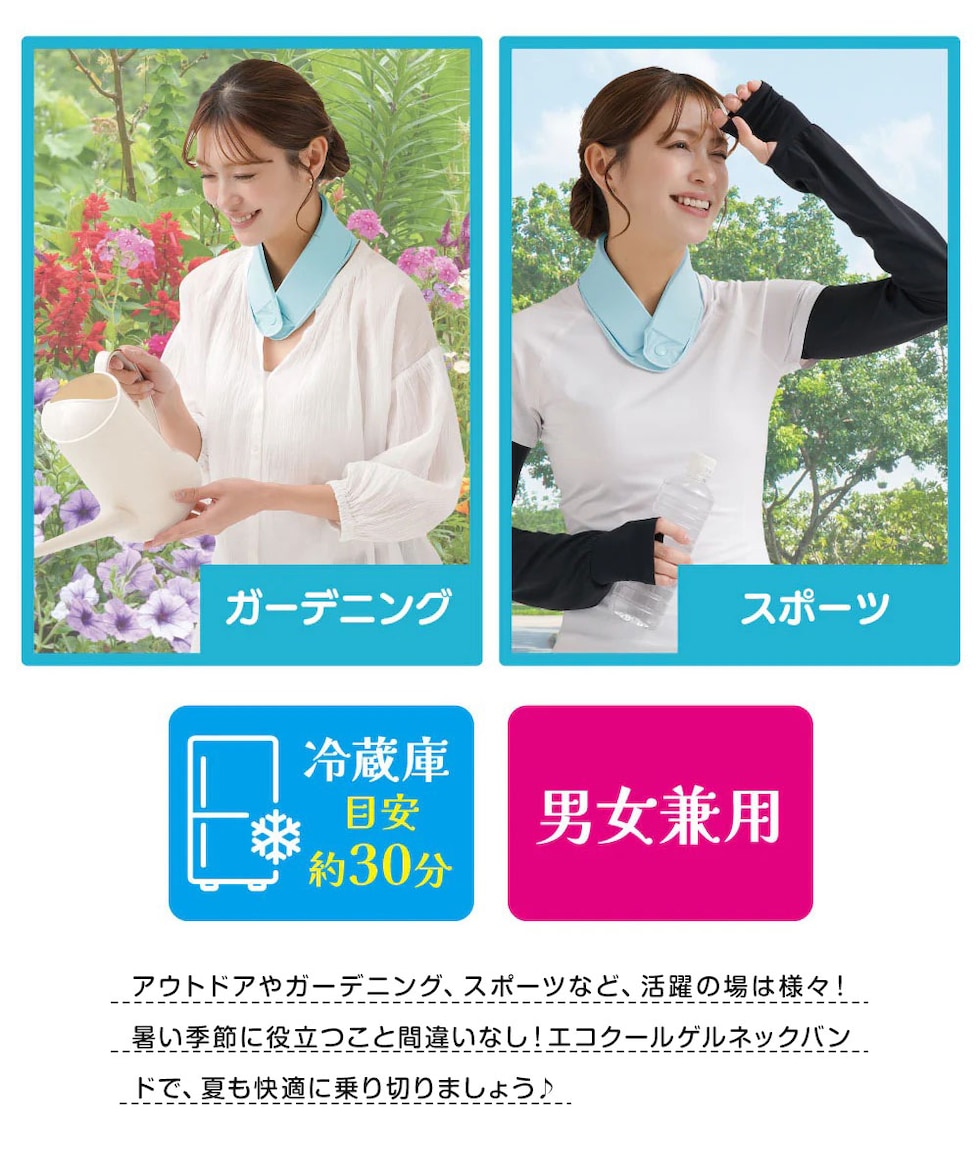 付け方かんたん♪くるっと巻いて、フロントのスナップボタンをパチッと留めるだけでOK!誰でも簡単に使えます。やわらかゲルだからこそ、女性にも男性にも子供でもご使用いただけます!アウトドアやガーデニング、スポーツなど、活躍の場は様々!暑い季節に役立つこと間違いなし!エコクールゲルネックバンドで、夏も快適に乗り切りましょう♪