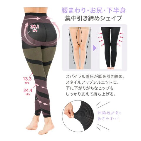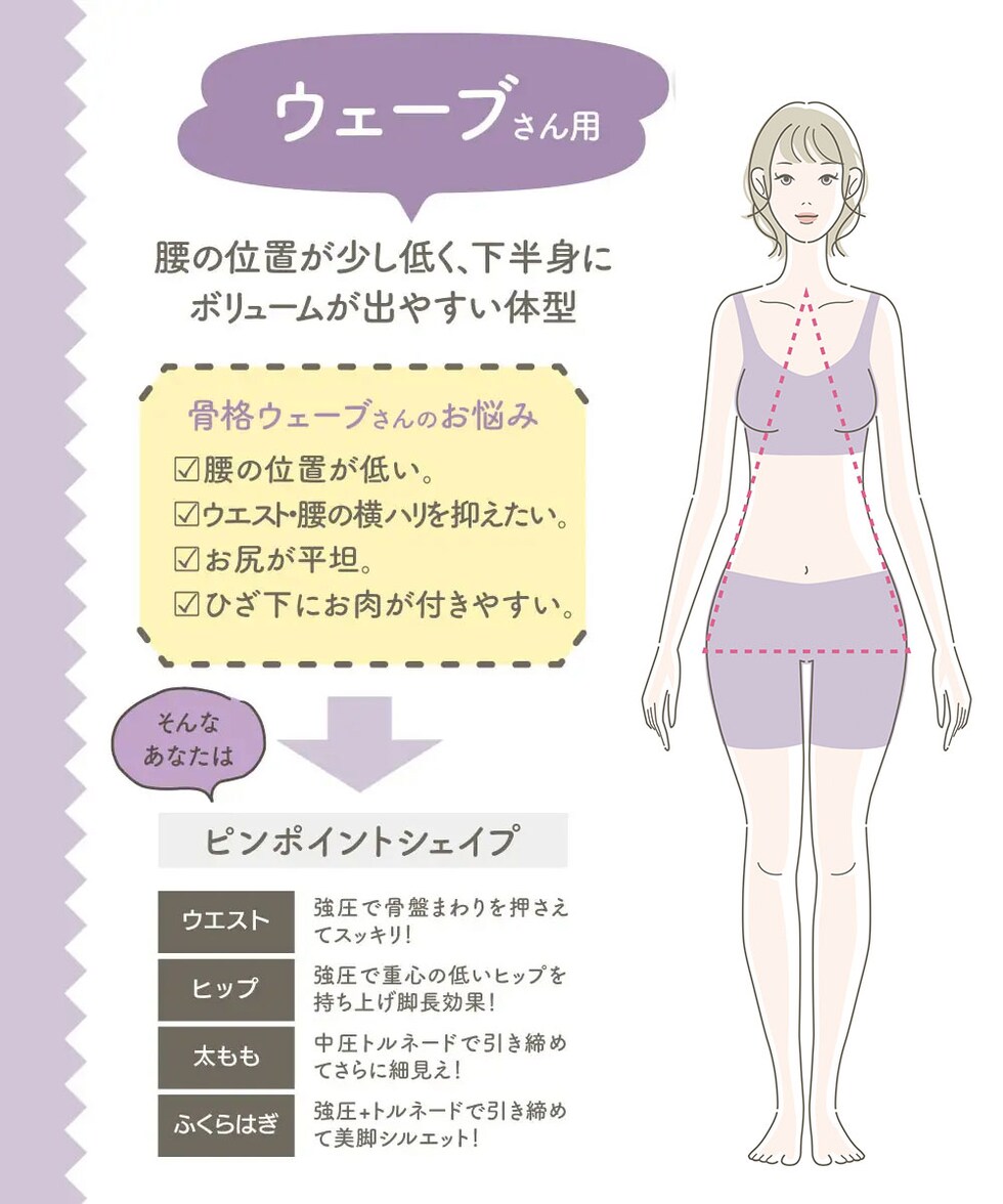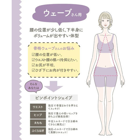腰の位置が低めで、下半身にボリュームが出やすいウェーブさんはウエストの広がりを抑え、ふくらはぎ~太ももまでスパイラル着圧で脚全体を引き締めて美脚シルエットに。