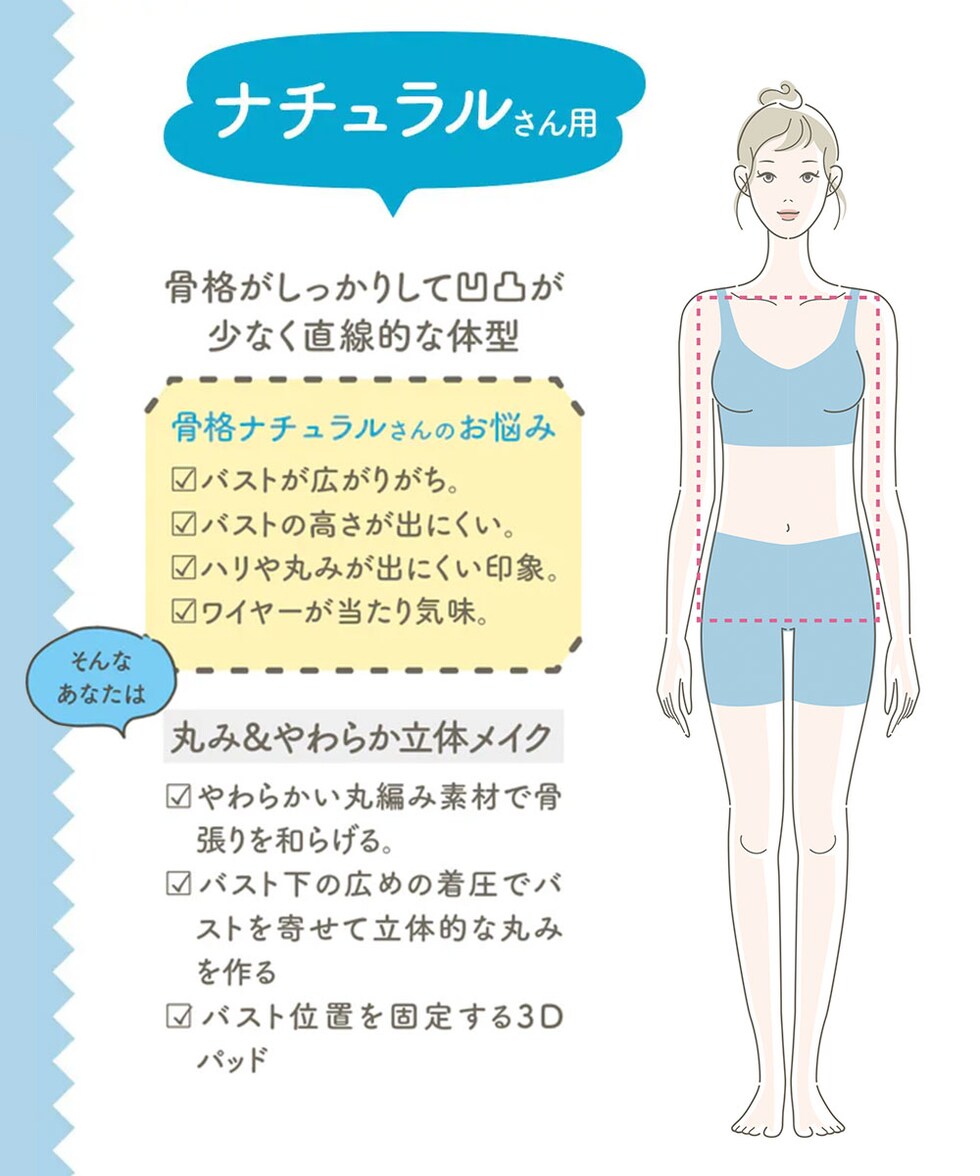 バストは広がりがちでフラットに見やすくハリや丸みが出にくいナチュラルさんは幅広の着圧が下から全体を持ち上げて立体感をアップ。