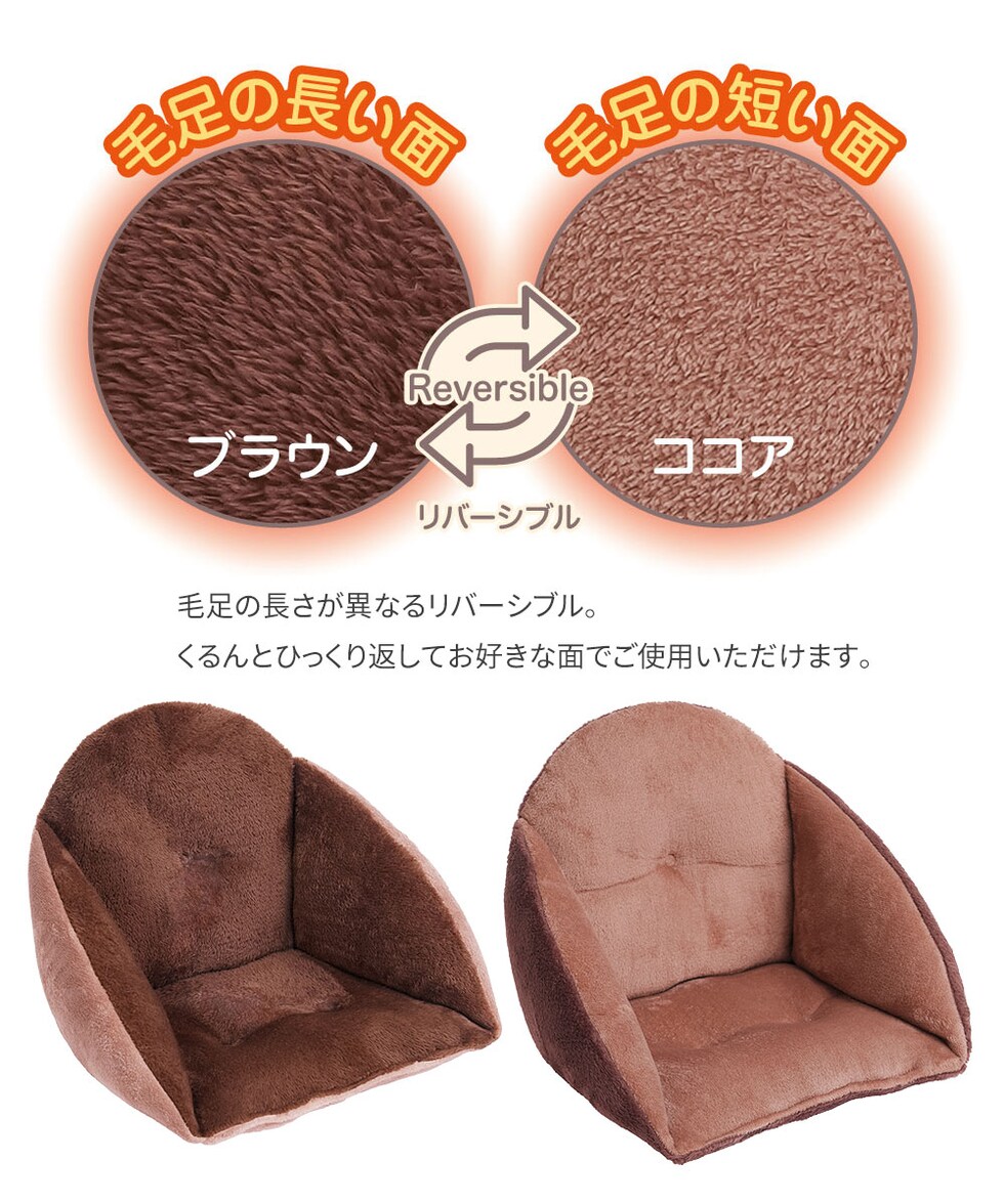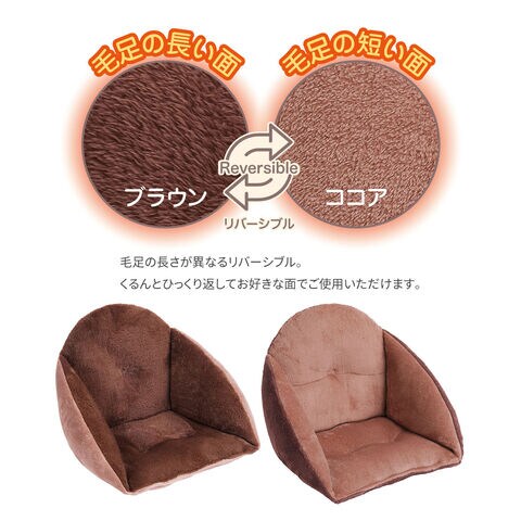 毛足の長さが異なるリバーシブル面をお好みに合わせて使え、座面は約10cmの厚みで快適な座り心地を提供。