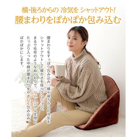腰まわりをすっぽり包み込み、横や後ろからの冷気をシャットアウトして暖かさを保つクッション。
