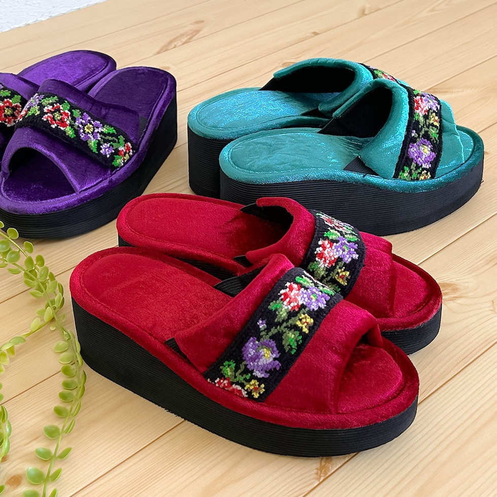 足元を彩るシェニール織りが華やかな厚底スリッパ。