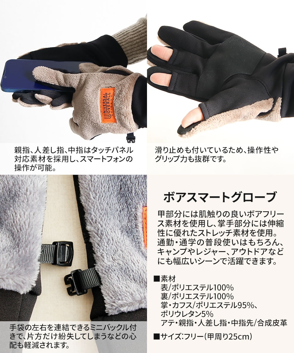 UNIVERSAL OVERALL ユニバーサルオーバーオール 手袋 メンズ 防寒 グローブ ボア スマート スマホ対応 指が出せる UO t1282