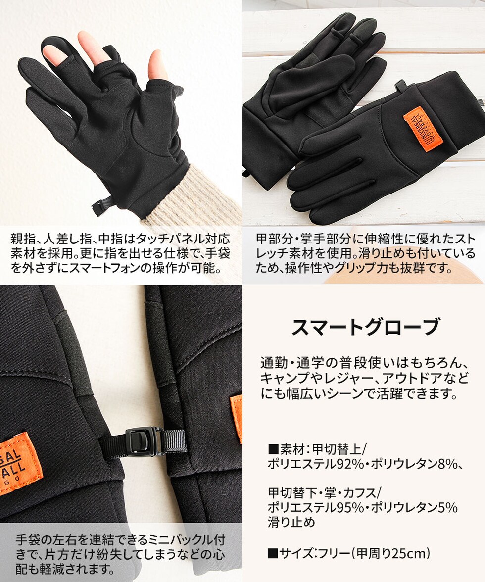 UNIVERSAL OVERALL ユニバーサルオーバーオール 手袋 防寒 グローブ スマホ対応 指が出せる ダイレクトタッチ 黒 UO t1444
