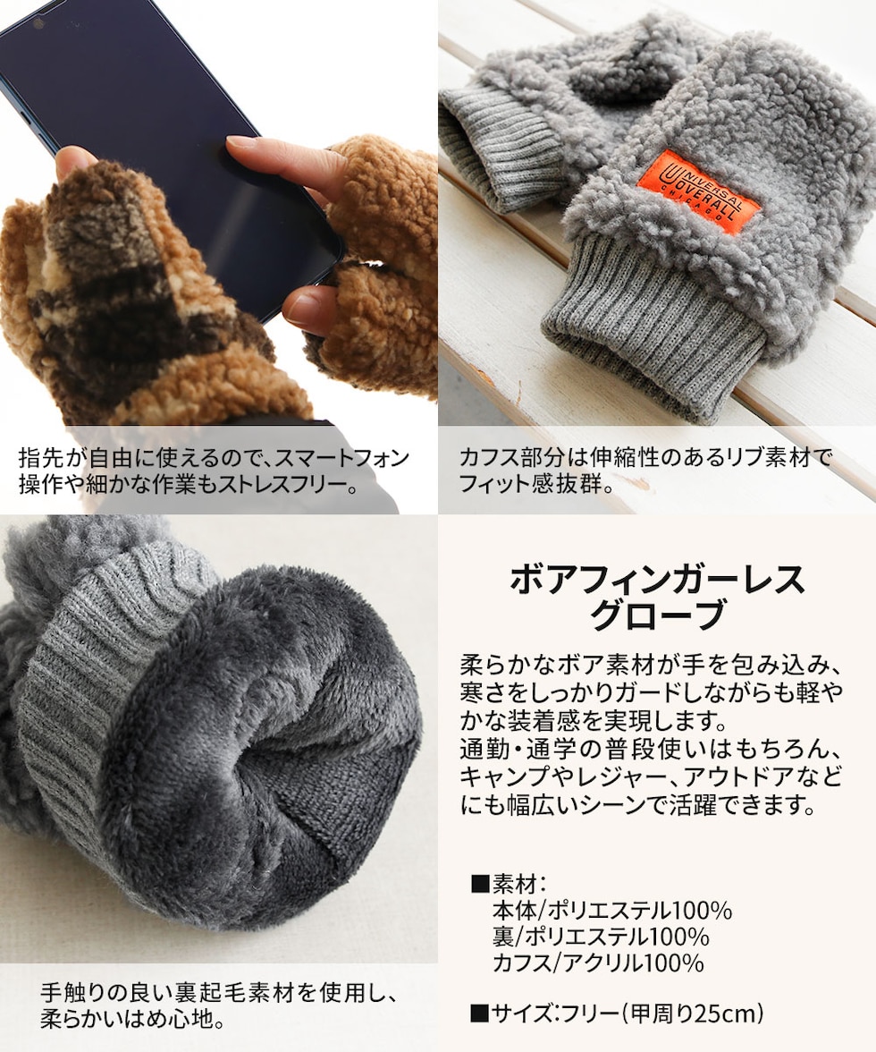 UNIVERSAL OVERALL ユニバーサルオーバーオール 手袋 指なし 暖かい ボア フィンガーレス グローブ スマホ対応 ブランド t1445
