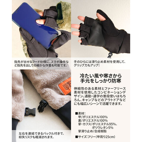 指先が出せるフード仕様に、スマホ操作など指先を出しての細かな作業も可能です。