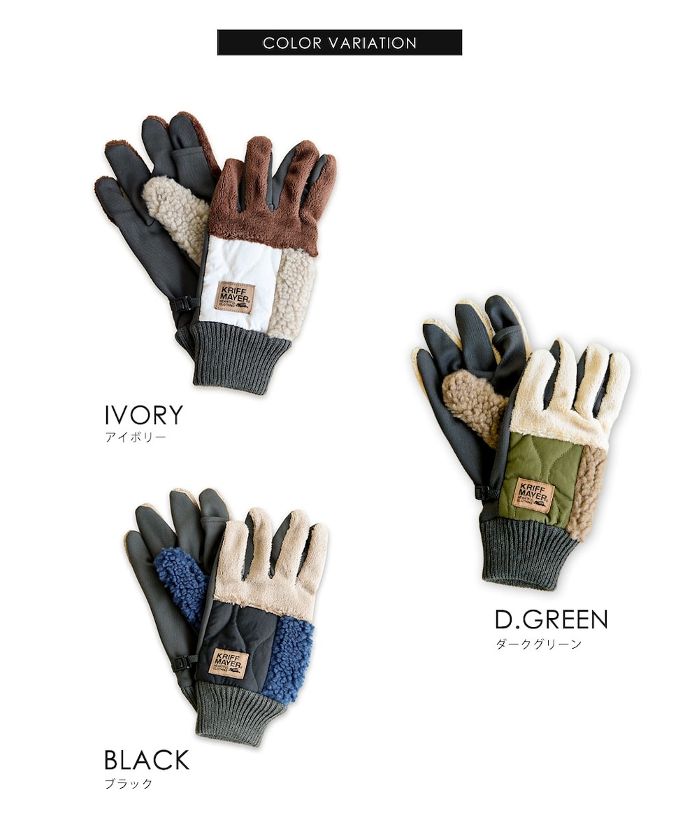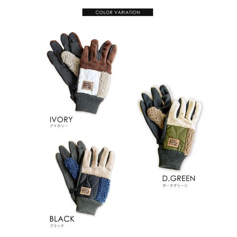 素材:甲切替ボア部分 ポリエステル100%|甲切替ナイロン部分 ナイロン60%・ポリエステル40%|掌 ポリエステル95%・ポリウレタン5%|カフス アクリル100%