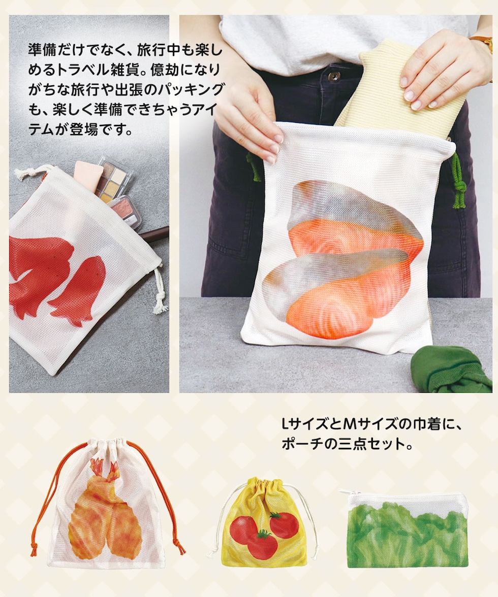 巾着袋 3点セット トラベルポーチ 旅行 入院 小物 収納 便利 整理整頓 仕分け シャケ&タコさん エビフライ&トマト 旅するお弁当 3点セット