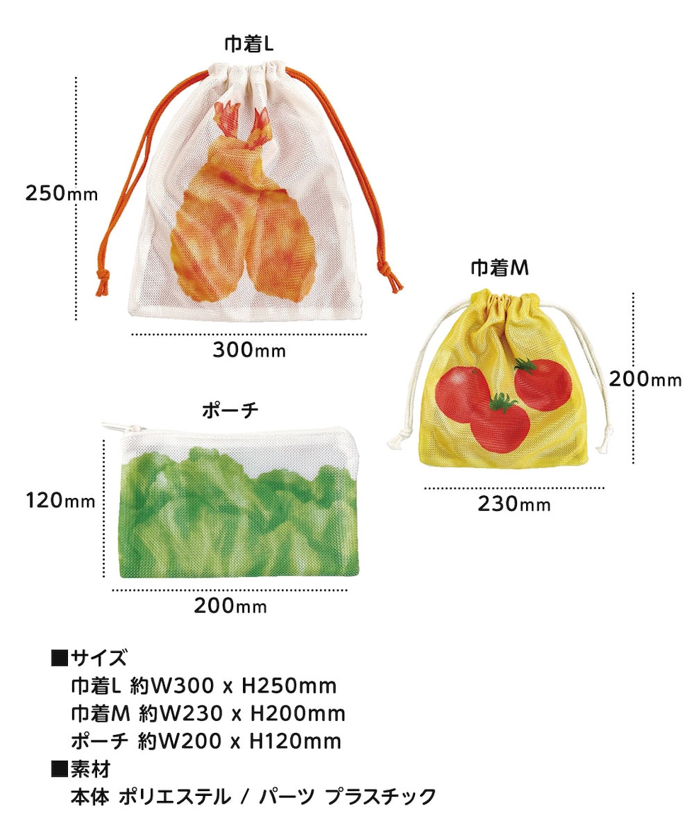 巾着L 約W300 x H250mm / 巾着M 約W230 x H200mm / ポーチ 約W200 x H120mm