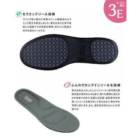 磨き込まれた床や凍結した路面でその効果を発揮、滑りにくく快適な歩行の為のソールです。