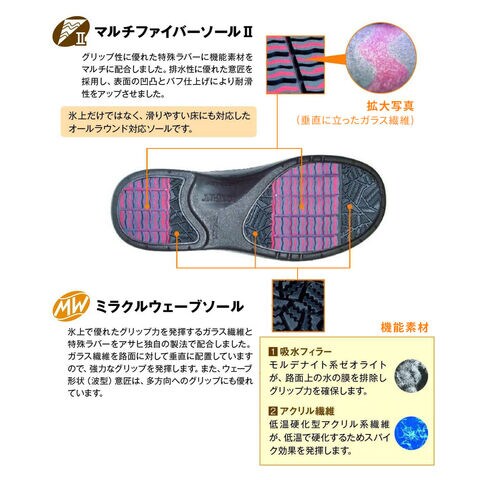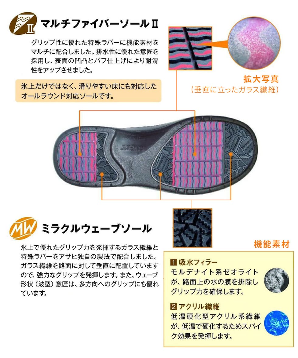 氷上で優れたグリップ力を発揮するガラス繊維と、異なる硬度の特殊ラバーを配合。