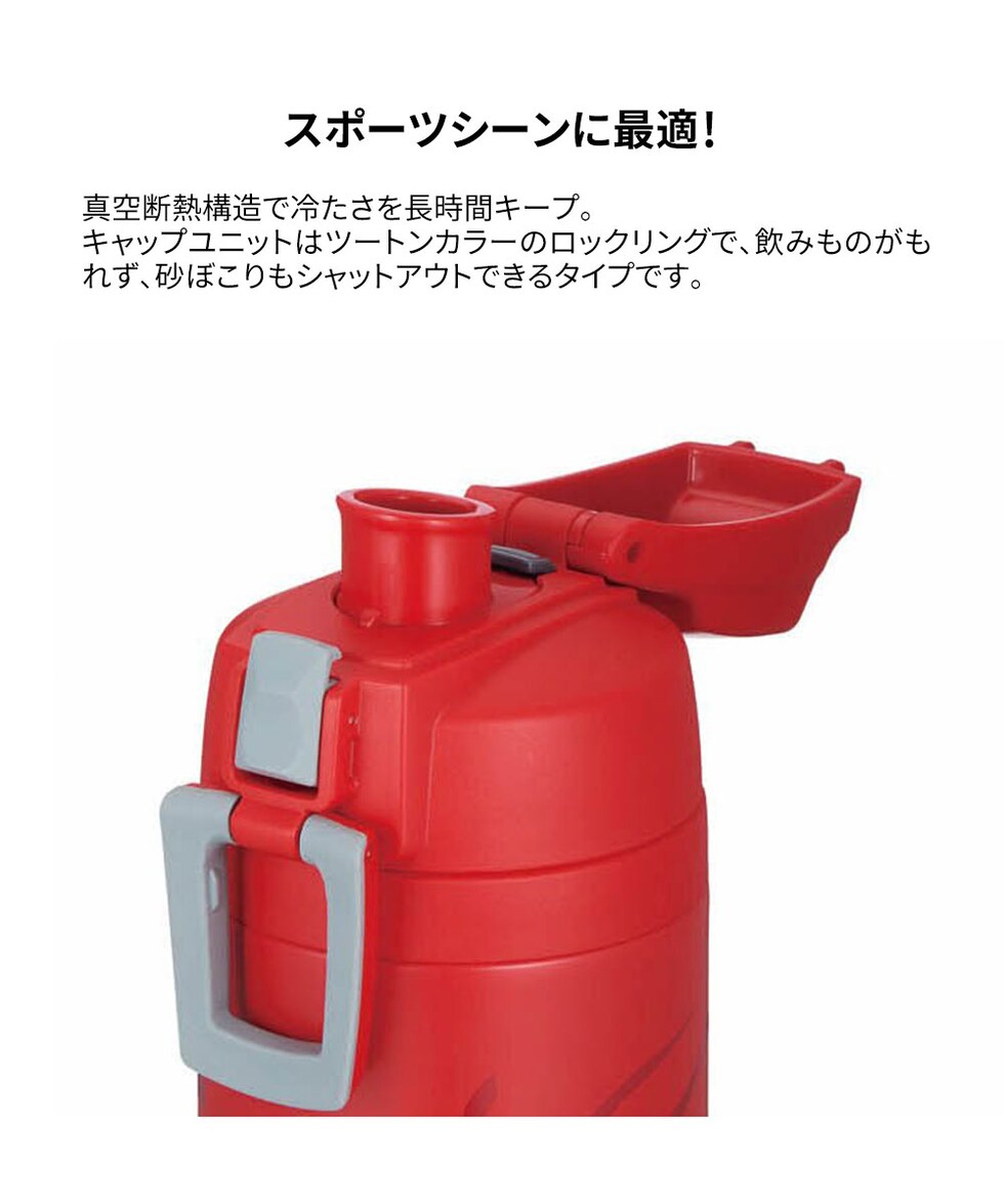 真空断熱構造で冷たさを長時間キープ。キャップユニットはツートンカラーのロックリングで、飲みものがもれず、砂ぼこりもシャットアウトできるタイプです。