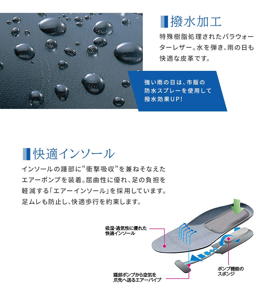 屈曲性に優れ、足の負担を軽減する「エアーインソール」を採用しています。