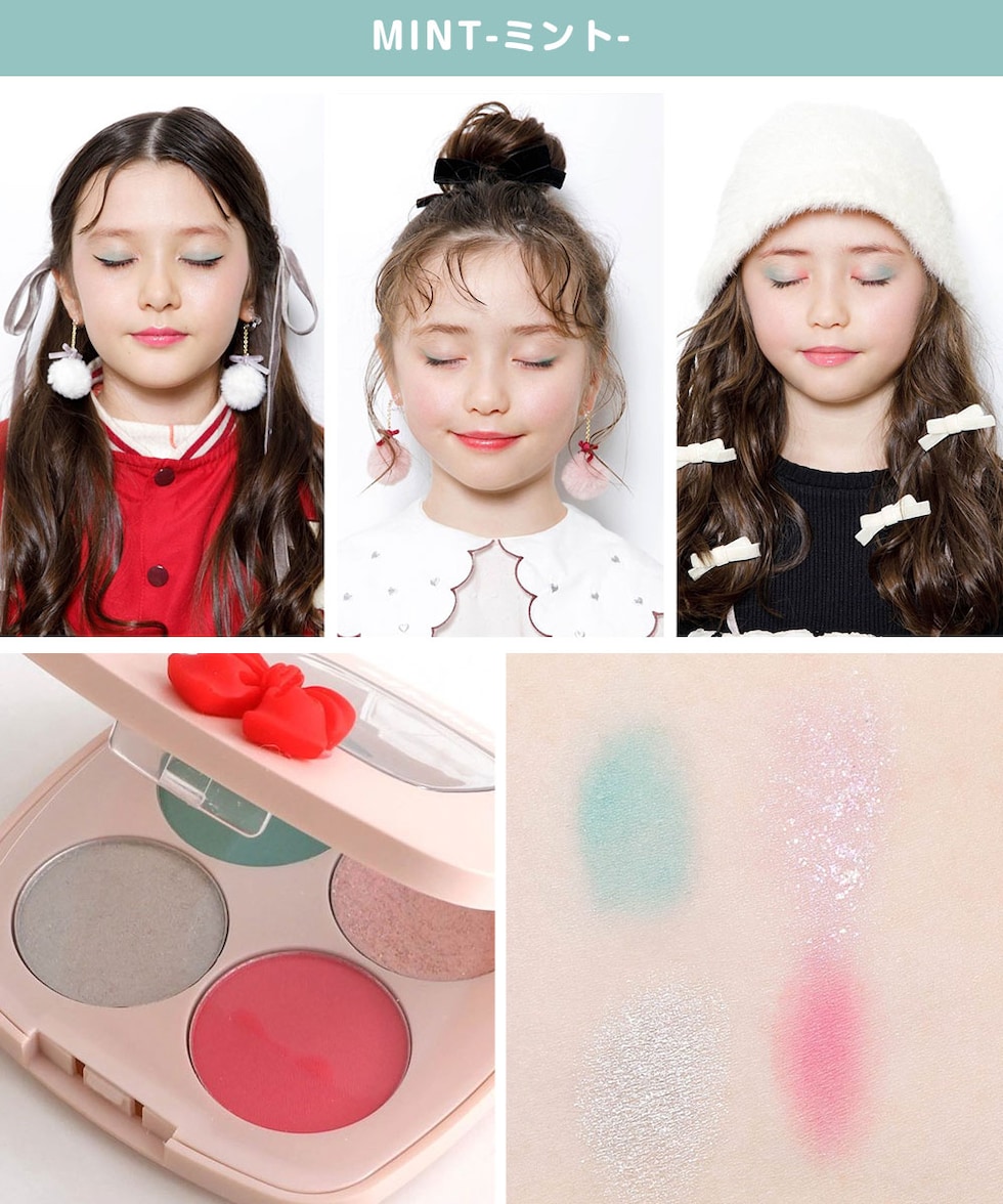 【ミント】アイカラー 1:マイカ、タルク、酸化チタン、ステアリン酸Mg、シリカ、ジメチコン、酸化鉄、青1、トリ(カプリル酸/カプリン酸)グリセリル、水酸化AI、ポリインプテン、パルミチン酸エチルヘキシル、フェノキシエタノール、黄4、水、トリエトキシカプリリルシラン、メチコン、エチルヘキシルグリセリン、塩化N a、硫酸N a。アイカラー2:合成フルオロフロゴパイト、マイカ、ステアリン酸Mg、トリ(カプリル酸/カプリン酸)グリセリル、ジメチコン、タルク、酸化チタン、フェノキシエタノール、酸化鉄、エチルヘキシルグリセリン。アイカラー3:PET、ビスジグリセリルポリアシルアジペートー 2、マイカ、酸化チタン、トリ(カプル酸/カプリン酸)カリセリル、ジメチコン、水添ポリイソプテン、合成ワックス、ポリインプテン、フェノキシエタノール、アクリレーツコポリマー、酸化スズ、エチルヘキシルグリセリン。アイカラー4:マイカ、タルク、ステアリン酸Mg、シリカ、ジメチコン、赤202、トリ(カプリル酸/カプリン酸)グリセリル、ポリインブテン、パルミチン酸エチルヘキシル、フェノキシエタノール、トリエトキシカプリリルシラン、黄5、水酸化AI、グンジョウ、酸化鉄、水、エチルヘキシルグリセリン、塩化N a、 酸Na