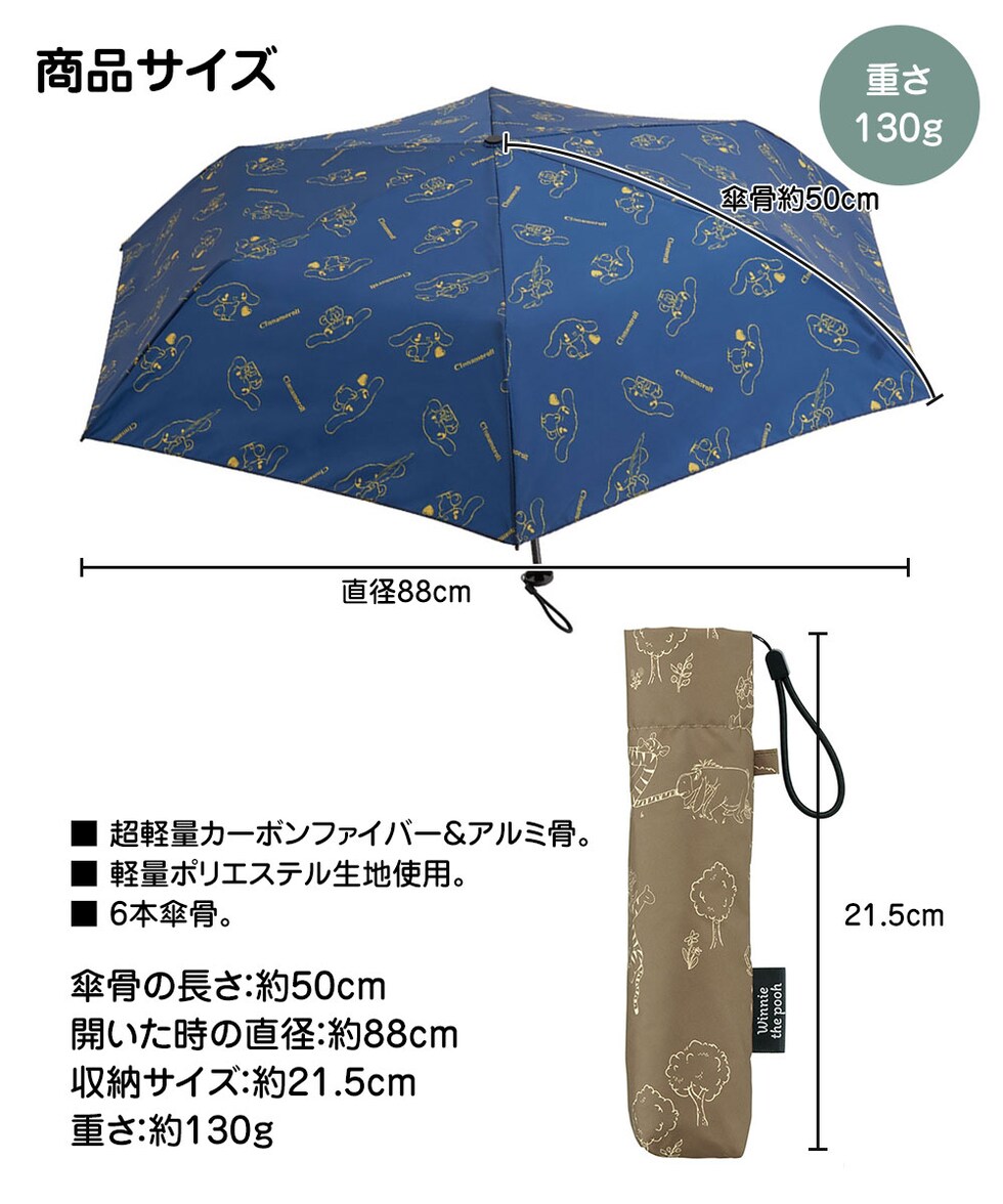 折りたたみ傘 軽量m 晴雨兼用 UVカット 撥水 軽い 手開き カーボンファイバー レイン シナモロール プーさん ブラウン ネイビー UBUWO50