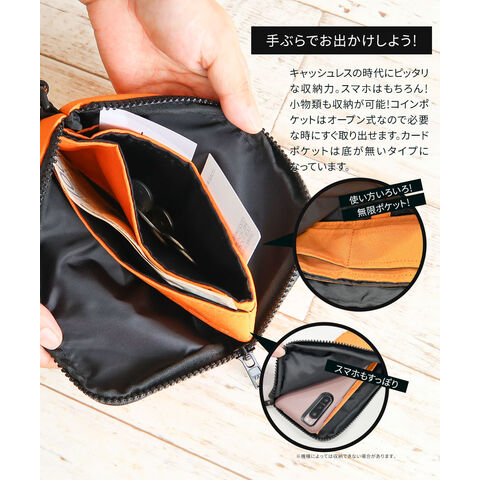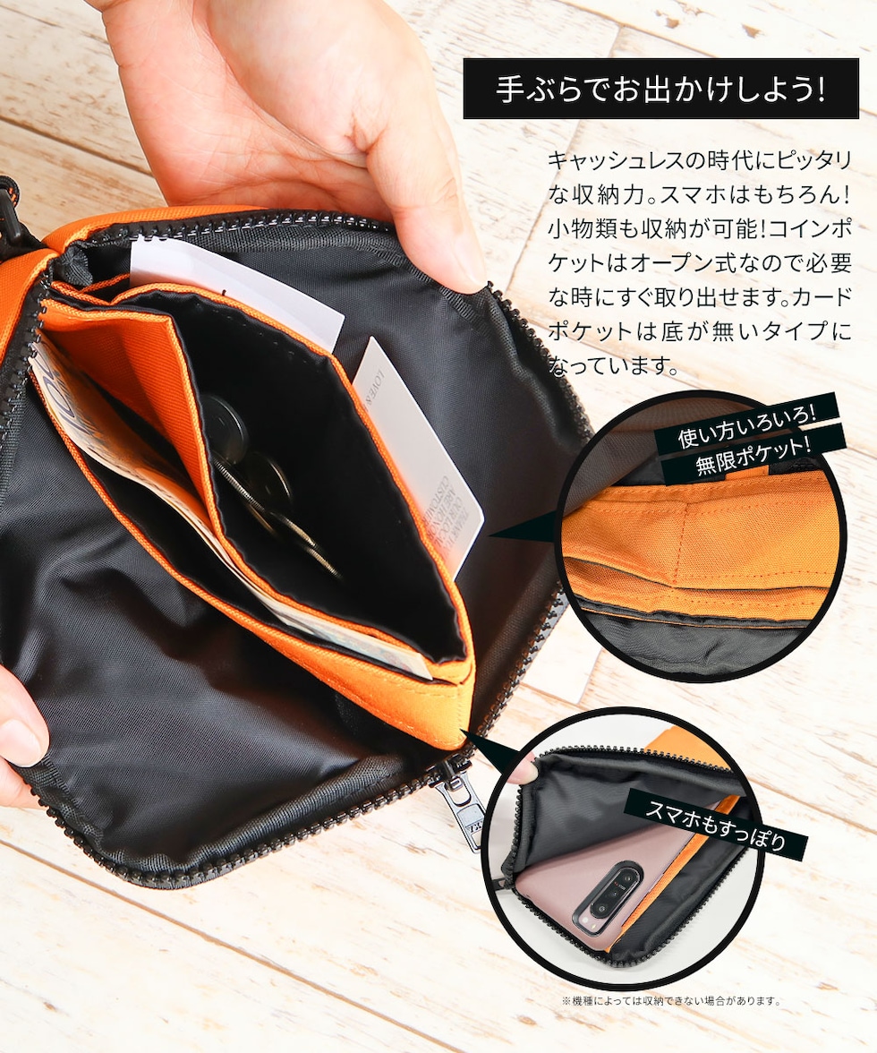 小銭やカード、カギなども入るのでマルチポーチのような使い方も出来る汎用性の高い一品。