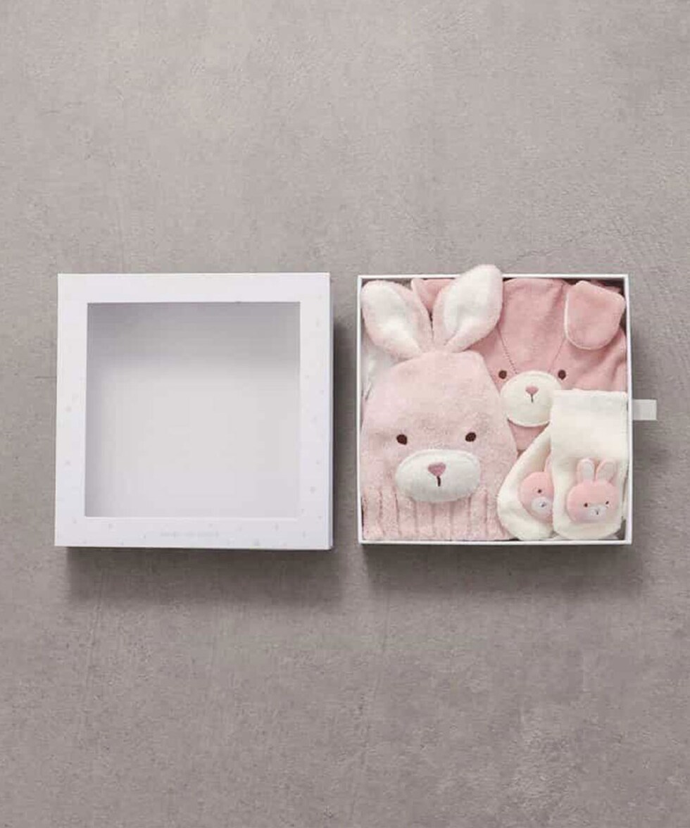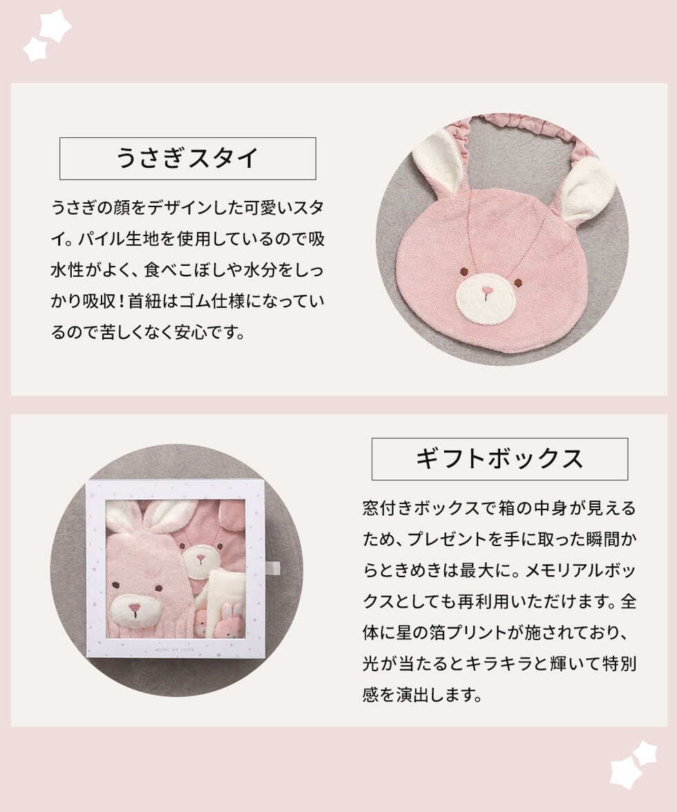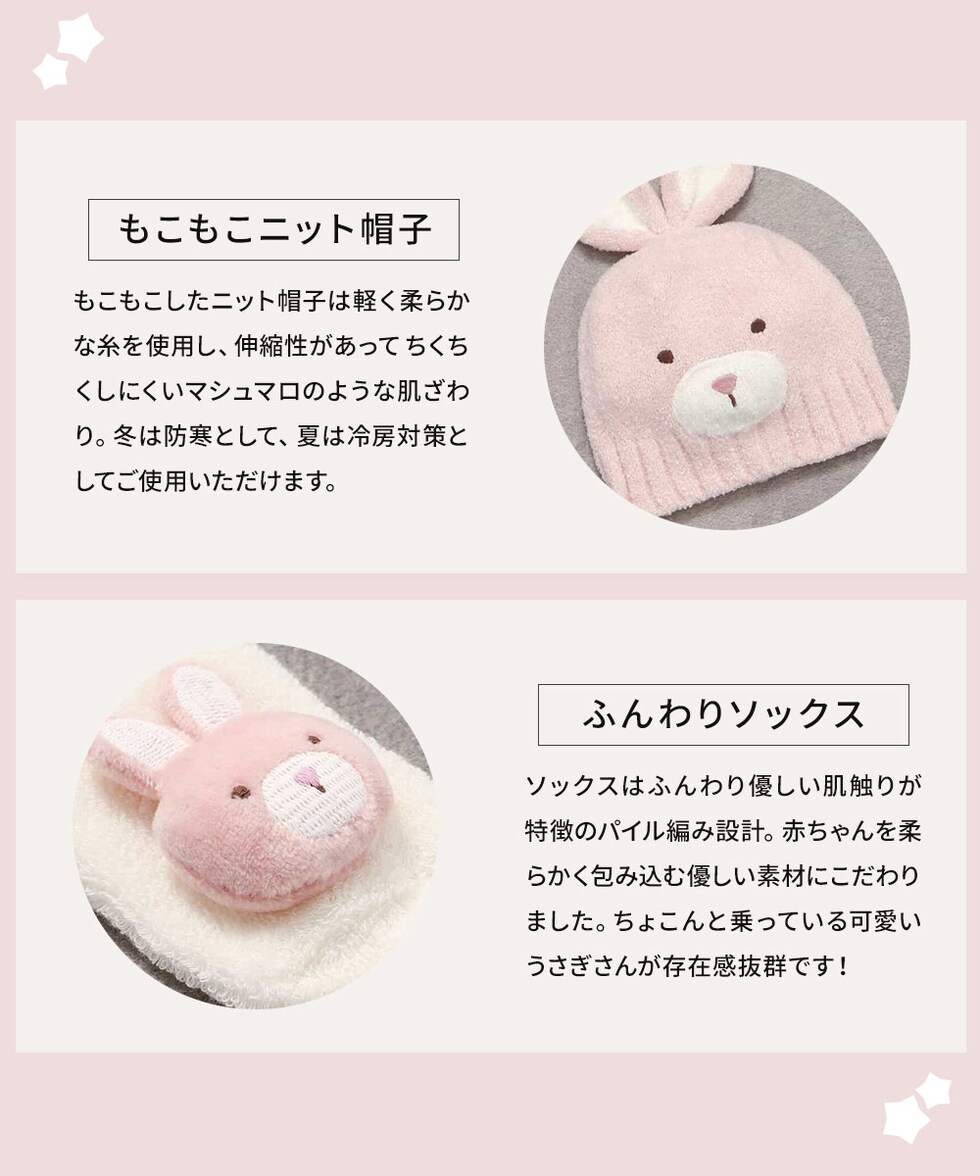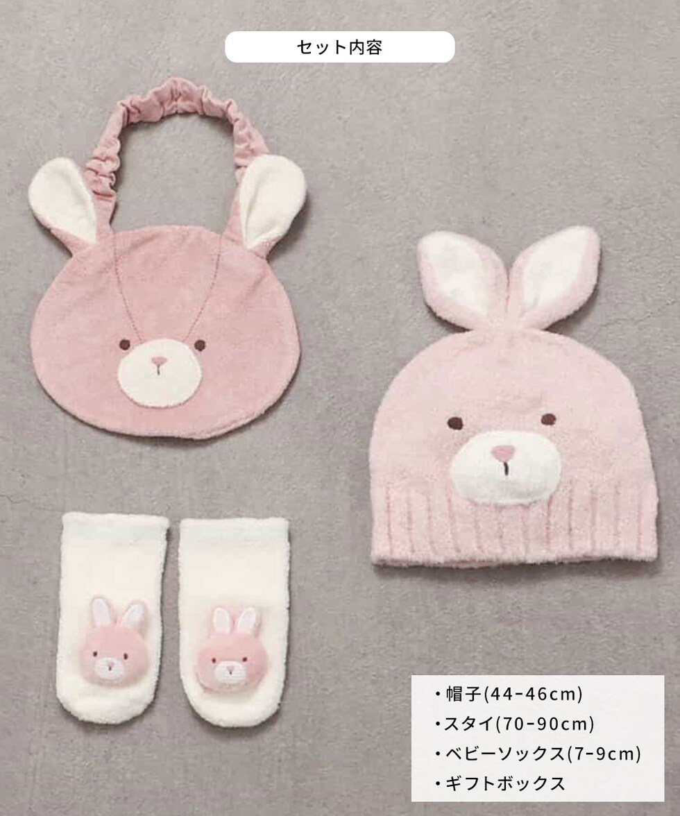 うさぎモチーフの帽子・スタイ・ソックスの3点セット。