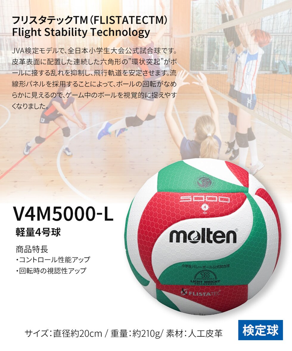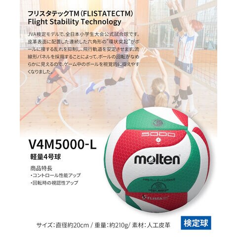 モルテン molten バレーボール 4号軽量 検定球 フリスタテック 軽量バレーボール5000 レディース キッズ ジュニア 部活 クラブ チーム 一般用 小学生 ボール 球 ソフト構造 全日本小学生大会公式試合球 カラー 白赤緑 V4M5000-L
