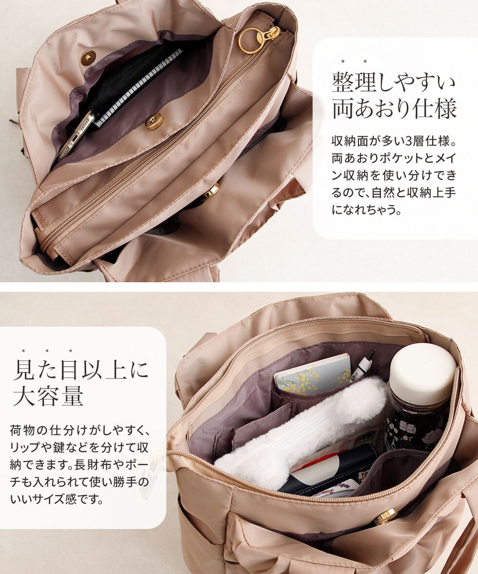 荷物の仕分けがしやすく、リップや鍵などを分けて収納できます。