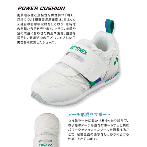 つま先を十分に動かせるゆったり設計で、お子様のアーチ形成をサポートすると共に、パワークッションインソールを搭載することで、足裏全面の衝撃をしっかり和らげる性能になっています。