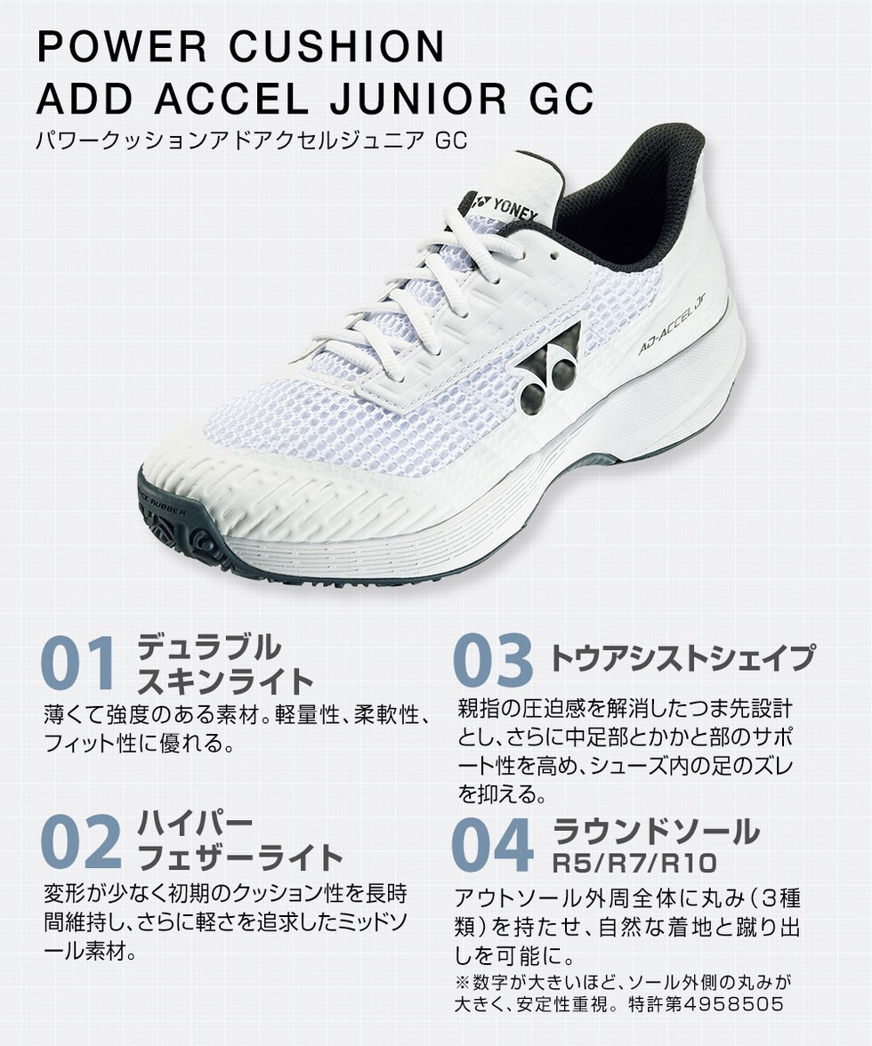 ジュニアの足に合わせた専用設計で、コートを駆け巡る加速力。
