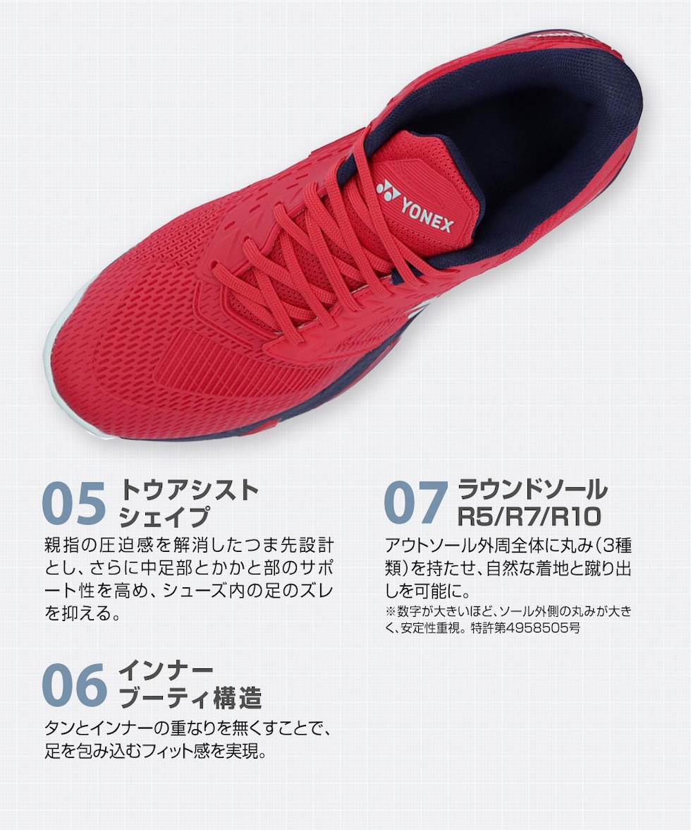 親指の圧迫感を解消したつま先設計とし、さらに中足部とかかと部のサポート性を高め、シューズ内の足のズレを抑える。