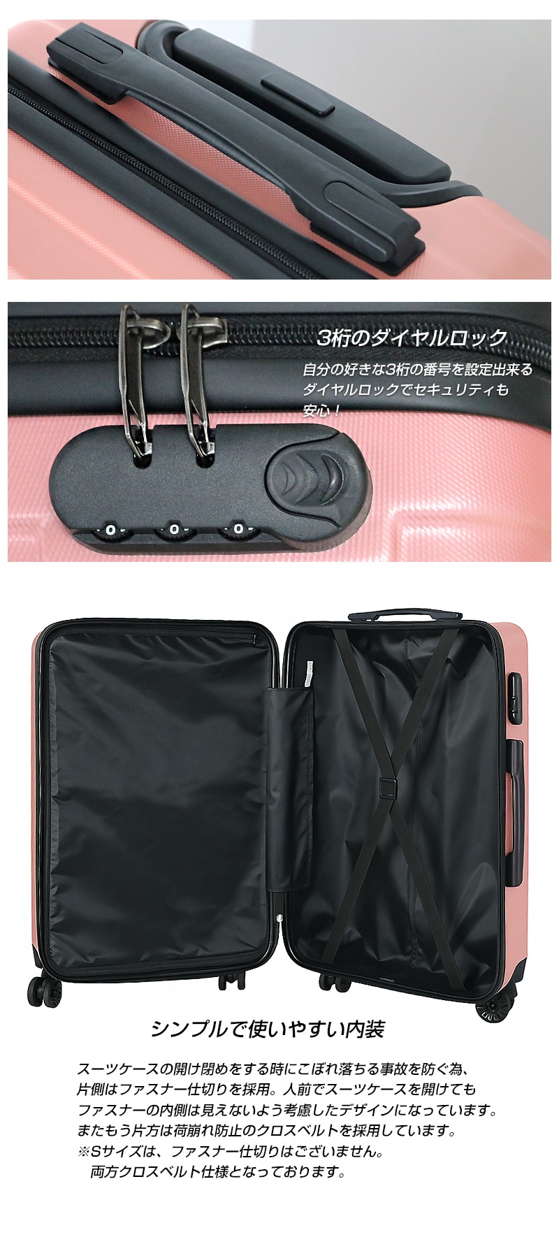 | 都会的なスタイリッシュなデザインが印象的。 サイズは良好や出張などシーンに合わせて選べるS/M/Lの3サイズ展開! 高い機能性とデザイン性を兼ね備えたキャリーケースが「Transporter」から登場です。 旅行やビジネスシーンに最適なパートナーになる事間違いなし! 【アップグレードされたABS素材でマットな質感そのままで傷が付きにくい】 スクラッチマットテクスチャを施した表面は、立体的な質感を高め表面の耐傷性をアップ。 【丈夫なスチール性のキャリーバー】 ワンタッチで簡単に引き上げて使えるキャリーバーは、シックなブラックカラーで全体の雰囲気を引き締めてくれる。 【360度回転ユニバーサルホイール】 全方向へスムーズに移動できるホイールで旅を快適に演出。 【3桁のダイヤルロック】 自分の好きな3桁の番号を設定出来るダイヤルロックでセキュリティも安心! 【シンプルで使いやすい内装】 高級感のあるシックな内装は荷崩れをおこさないよう両側にクロスベルトを施しています。 カラーは、シーンや好みに合わせて選べるホワイト、ブラック、シルバー、ローズゴールド、ライトブルー、ライトグリーンの6色展開。 サイズもS・M・Lの3種類からお選びいただけます。 都会的な印象を与える洗練されたデザインと、軽さ・丈夫さ・機能性のバランスを追求した「Transporter」は、移動をもっと快適に、もっとスマートにしてくれるキャリーケースです。 |