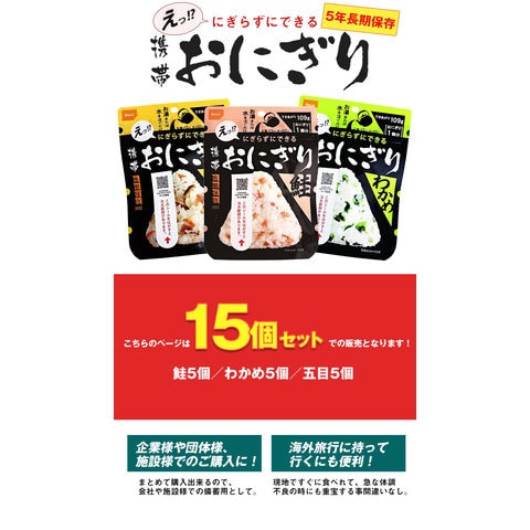 製造より5年保存可能! ※流通の段階で多少のお時間がかかるため、お手元に届く際には賞味期限が5年を切る場合もございます(賞味期限4年以上を保証) 長期保存用おにぎり15個セットのページになります。 お湯又は水を入れるだけで、具材の旨みがギュッとおいしい三角形のおにぎりが出来上がります。 (お湯約15分/水約60分) 炊き立てご飯のおいしさそのままに。 災害時こそ、しっかりおいしいご飯を。 非常用持ち出し袋の中に追加したり、ご家族用にご用意される時にぴったりの非常食セットです。 賞味期限の近い非常食の入れ替え、詰め替えにも。 アウトドア、キャンプ・海外旅行の好適品としてもお使いいただけます! 100%国産米を使用した、おいしくいただける防災食品セットとなっております。 -セット内容- ●携帯おにぎり(鮭)×5個 ●携帯おにぎり(わかめ)×5個 ●携帯おにぎり(五目)×5個 ■原産国:日本 -ご注意- ■災害発生後はご注文が非常に殺到いたします。納期にお時間をいただく場合がございます。セット内容は予告なく、同等の品に変更になる場合がございます。 ■商品サイズ・カラーは、企画サイズとなります。 ■掲載の商品画像につきましては、モニターの種類・設定等により、実際の商品とは素材感や色味が異なる見え方をする場合があります。 ■細かなキズや、製造上避けられないシミ・シワなどがある場合があります。 ■商品仕様は、予告無く仕様変更される場合がございます。セット内容は予告なく同等の品に変更になる場合がございます。予めご了承下さい。 ■商品によっては、他店と在庫共有しているものがございますので、ご注文を頂戴した時点で、 在庫が確保できない商品につきましては、 ご注文をキャンセルさせていただく場合がございます。 なにとぞ、ご了承の程、よろしくお願いいたします。 ■アウトレット品につき国内での検品は一切しておりません。 ■アウトレットにて販売しておりますので、細かなキズや、製造上避けられないシミ・シワなどがある場合があります。ご使用に差し支えのない汚れ等の瑕疵につきましては、ご容赦頂きますようお願い致します。 |