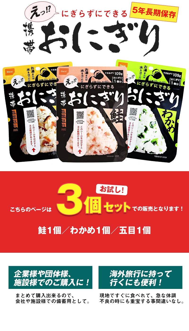 製造より5年保存可能! ※流通の段階で多少のお時間がかかるため、お手元に届く際には賞味期限が5年を切る場合もございます(賞味期限4年以上を保証) 長期保存用おにぎり「お試し」3個セットのページになります。 お湯又は水を入れるだけで、具材の旨みがギュッとおいしい三角形のおにぎりが出来上がります。 (お湯約15分/水約60分) 炊き立てご飯のおいしさそのままに。 災害時こそ、しっかりおいしいご飯を。 非常用持ち出し袋の中に追加したり、ご家族用にご用意される時にぴったりの非常食セットです。 賞味期限の近い非常食の入れ替え、詰め替えにも。 アウトドア、キャンプ・海外旅行の好適品としてもお使いいただけます! 100%国産米を使用した、おいしくいただける防災食品セットとなっております。 -セット内容- ●携帯おにぎり(鮭)×1個 ●携帯おにぎり(わかめ)×1個 ●携帯おにぎり(五目)×1個 ■原産国:日本 -ご注意- ■災害発生後はご注文が非常に殺到いたします。納期にお時間をいただく場合がございます。セット内容は予告なく、同等の品に変更になる場合がございます。 ■商品サイズ・カラーは、企画サイズとなります。 ■掲載の商品画像につきましては、モニターの種類・設定等により、実際の商品とは素材感や色味が異なる見え方をする場合があります。 ■細かなキズや、製造上避けられないシミ・シワなどがある場合があります。 ■商品仕様は、予告無く仕様変更される場合がございます。セット内容は予告なく同等の品に変更になる場合がございます。予めご了承下さい。 ■商品によっては、他店と在庫共有しているものがございますので、ご注文を頂戴した時点で、 在庫が確保できない商品につきましては、 ご注文をキャンセルさせていただく場合がございます。 なにとぞ、ご了承の程、よろしくお願いいたします。 ■アウトレット品につき国内での検品は一切しておりません。 ■アウトレットにて販売しておりますので、細かなキズや、製造上避けられないシミ・シワなどがある場合があります。ご使用に差し支えのない汚れ等の瑕疵につきましては、ご容赦頂きますようお願い致します。 |