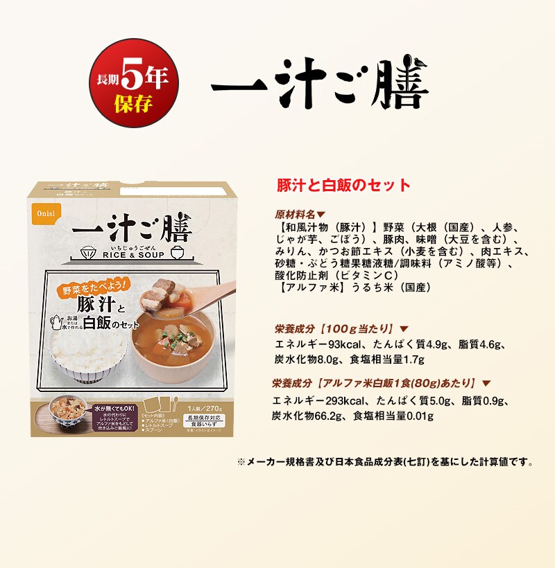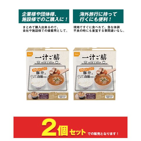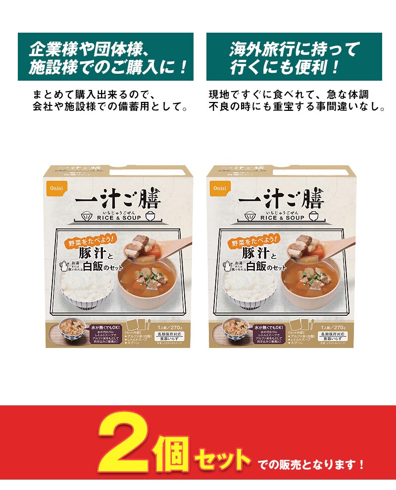 製造より5年保存可能! 水が無くてもOK、アルファ米にお汁を注ぐことで、水が用意できないときにも炊き込みご飯風にお召し上がり頂けます。 賞味期限の近い非常食の入れ替え、詰め替えにも。 アウトドア、キャンプ・海外旅行の好適品としてもお使いいただけます! -セット内容- ●豚汁と白飯のセット×2個 ■原産国:日本 -ご注意- ■災害発生後はご注文が非常に殺到いたします。納期にお時間をいただく場合がございます。セット内容は予告なく、同等の品に変更になる場合がございます。 ■商品サイズ・カラーは、企画サイズとなります。 ■掲載の商品画像につきましては、モニターの種類・設定等により、実際の商品とは素材感や色味が異なる見え方をする場合があります。 ■細かなキズや、製造上避けられないシミ・シワなどがある場合があります。 ■商品仕様は、予告無く仕様変更される場合がございます。セット内容は予告なく同等の品に変更になる場合がございます。予めご了承下さい。 ■商品によっては、他店と在庫共有しているものがございますので、ご注文を頂戴した時点で、 在庫が確保できない商品につきましては、 ご注文をキャンセルさせていただく場合がございます。 なにとぞ、ご了承の程、よろしくお願いいたします。 ■アウトレット品につき国内での検品は一切しておりません。 ■アウトレットにて販売しておりますので、細かなキズや、製造上避けられないシミ・シワなどがある場合があります。ご使用に差し支えのない汚れ等の瑕疵につきましては、ご容赦頂きますようお願い致します。 |