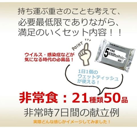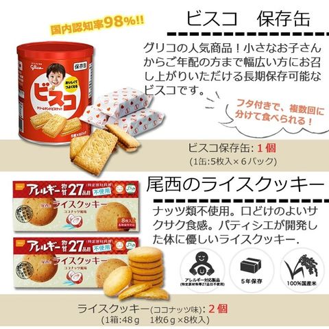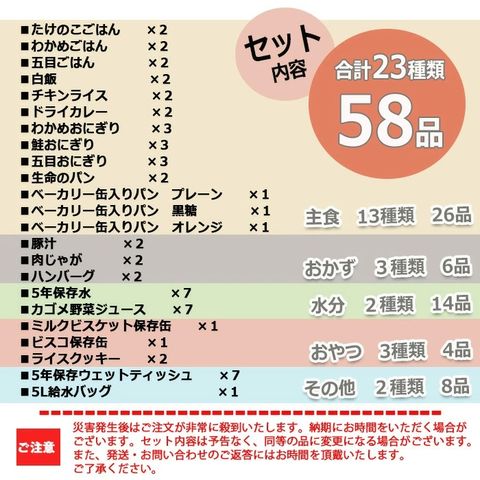 こちらは非常・保存食23種類58点セットのページです。 おひとり様、約7日分の非常食として。 分けあってご家族分として。 賞味期限の近いものの、詰め替え用として。 キャンプ、アウトドアでの使用に。 お友達、ご近所様と分け合い。 企業様、自治体などの備蓄用に。 製造より5年保存可能! ※流通の段階で多少のお時間がかかるため、お手元に届く際には賞味期限が5年を切る場合もございます(賞味期限4年以上を保証) アルファ米、ごはん、おにぎりは、 お湯で約15分、水で約60分でおいしいごはんが出来上がり。 すべて国産米を使用し、非常用持ち出し袋などにセットしたり、キャンプなどでもお使いいただける 美味しく手軽なごはんです! 缶入りパンもふんわりおいしく、避難先で心が安らぐビスコ、クッキーなどのおやつも入っています。 ライスクッキーはパティシエ監修で、非常食とは思えないおいしさです! 非常用持ち出し袋の中に追加したり、ご家族用にご用意される時にぴったりの単品販売となります。 アウトドア、キャンプでもお使いいただけます! -セット内容- ●5年保存水×7 ●5年保存 野菜ジュース×7 ●五目ごはん×2 ●わかめごはん×2 ●たけのこごはん×2 ●白飯×2 ●チキンライス×2 ●ドライカレー×2 ●鮭おにぎり×3 ●わかめおにぎり×3 ●五目おにぎり×3 ●生命のパン×2 ●ベーカリー缶入りパン(プレーン)×1 ●ベーカリー缶入りパン(黒糖)×1 ●ベーカリー缶入りパン(オレンジ)×1 ●豚汁×2 ●肉じゃが×2 ●ハンバーグ×2 ●ミルクビスケット缶×1 ●ビスコ×1 ●ライスクッキー×2 水・非常食 合計21種類50点と、 ●5年保証・ウェットティッシュ×7 ●非常用・給水バッグ×1 総合計58点のセットとなります。 ■原産国:日本 -ご注意- ■災害発生後はご注文が非常に殺到いたします。納期にお時間をいただく場合がございます。セット内容は予告なく、同等の品に変更になる場合がございます。 また、発送・お問い合わせのご返答にはお時間を頂戴いたします。ご了承ください。 ■商品サイズ・カラーは、企画サイズとなります。 ■商品画像につきましては、モニターの種類・設定等により、実際の商品とは素材感や色味が異なる見え方をする場合があります。 ■細かなキズや、製造上避けられないシミ・シワなどがある場合があります。 ■商品仕様は、予告無く仕様変更される場合がございます。また、セット内容は予告なく同等の品に変更になる場合がございます。予めご了承下さい。 ■商品によっては、他店と在庫共有しているものがございますので、ご注文を頂戴した時点で、 在庫が確保できない商品につきましては、 ご注文をキャンセルさせていただく場合がございます。 なにとぞ、ご了承の程、よろしくお願いいたします。 |