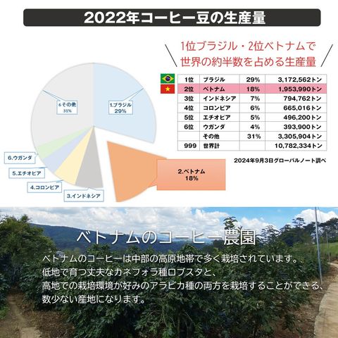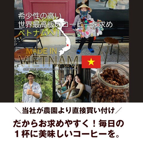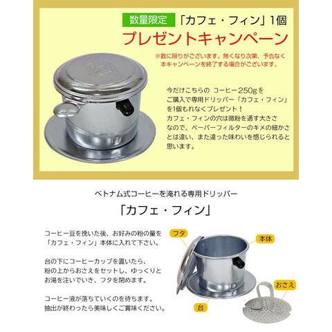 | 香り高いベトナム珈琲を当社直接買い付けによりお求めやすく! 希少なアラビカ豆を中心にプレミアムにブレンドした中挽きのコーヒー粉。 たっぷり250gで毎日の1杯にもピッタリ! さらに、ベトナムの伝統的抽出器具「カフェフィン」を1つお付けします。 ご自宅で本場の味をゆっくりと楽しむもよし、コーヒー好きの方への贈り物にも最適です。 そのままでも美味しくいただけますし、伝統的なベトナム式コーヒーの飲み方として お砂糖や練乳をたっぷり加える飲み方にもぴったり。 ※コーヒー豆のパッケージデザインは変更になる場合がございます。 【毎日の一杯はもちろん、大切な方への贈り物にも最適です。】 ■誕生日プレゼント コーヒー好きなご友人・ご家族に贈る、パーソナルギフトに最適。 ■お中元・お歳暮・父の日・母の日など 季節の挨拶として、上質なコーヒーを。感謝の気持ちを込めて、日常で楽しめる贈り物を。 ■結婚祝いや引っ越し祝いなど 新生活を彩るおしゃれなギフトとして喜ばれる贈り物を。 ■出産内祝い・快気祝いなど お返し品として上質で万人受けするコーヒーは好印象。 ■バレンタイン・ホワイトデーなど 甘いものが苦手な人にも◎、大人向けギフトとして喜ばれます。 ■クリスマスプレゼント 冬の暖かい時間を過ごすためのアイテムとしてコーヒーは人気です。 ■その他にもビジネスシーンでも人気 ビジネスパートナーや取引先へのフォーマルなギフトとして。 また訪問時の手土産として、気を遣わせず、センスのある贈り物として活躍してくれます。 ※こちらのページは、コーヒー粉での販売ページとなります。 ※パッケージデザインは変更になる場合がございます。 |